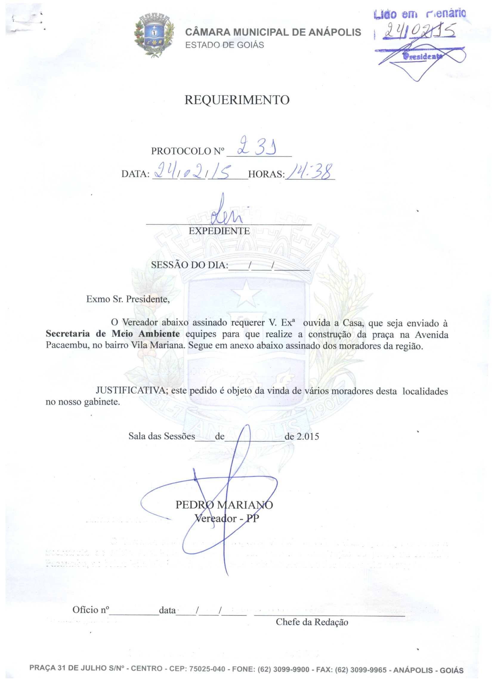 Ementa: O VEREADOR ABAIXO ASSINADO REQUER À V. EXA OUVIDA A CASA, QUE SEJA ENVIADO À SECRETARIA DE MEIO AMBIENTE EQUIPES PARA QUE REALIZE A CONSTRUÇÃO DA PRAÇA NA AVENIDA PACAEMBU, NO BAIRRO VILA MARIANA.