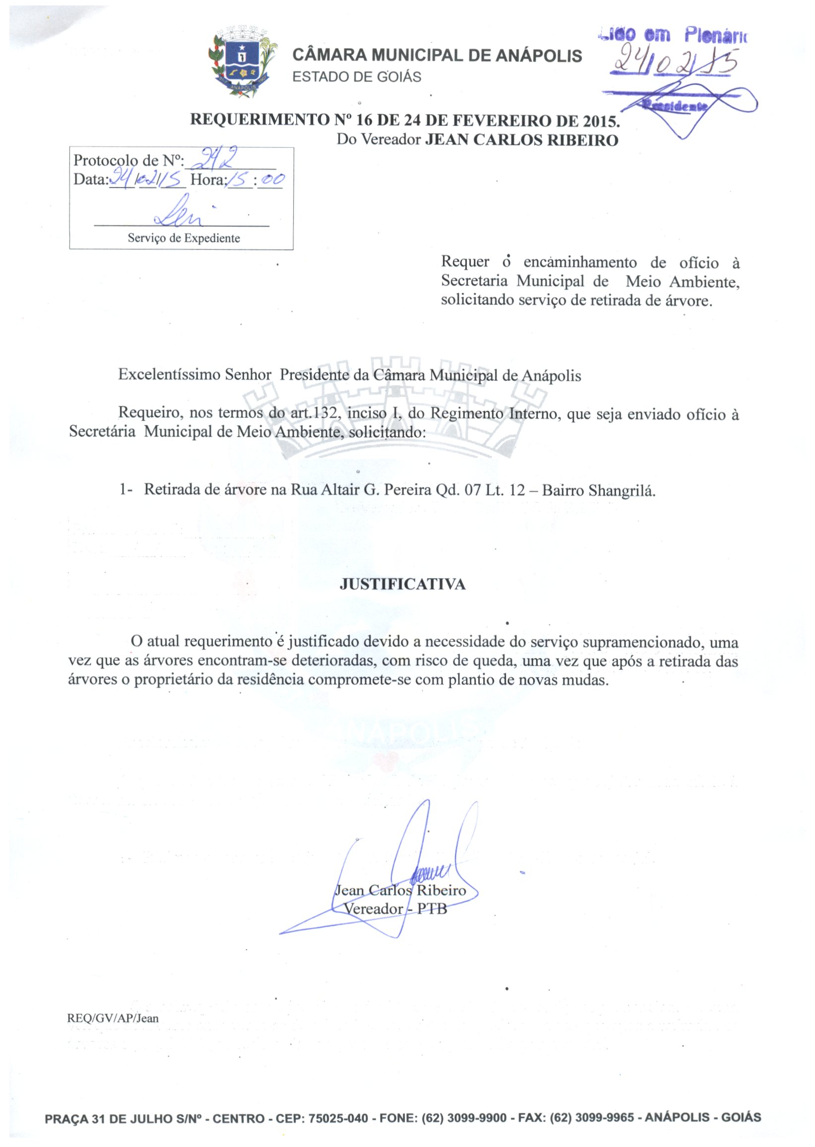 Ementa: REQUEIRO, NOS TERMOS DO ART.132, INCISO I, DO REGIMENTO INTERNO, QUE SEJA ENVIADO OFÍCIO Á SECRETARIA MUNICIPAL DE MEIO AMBIENTE, SOLICITANDO: 1- RETIRADA DE ÁRVORE NA RUA ALTAIR G. PEREIRA, QD. 07, LT. 12, BAIRRO SHANGRILÁ.