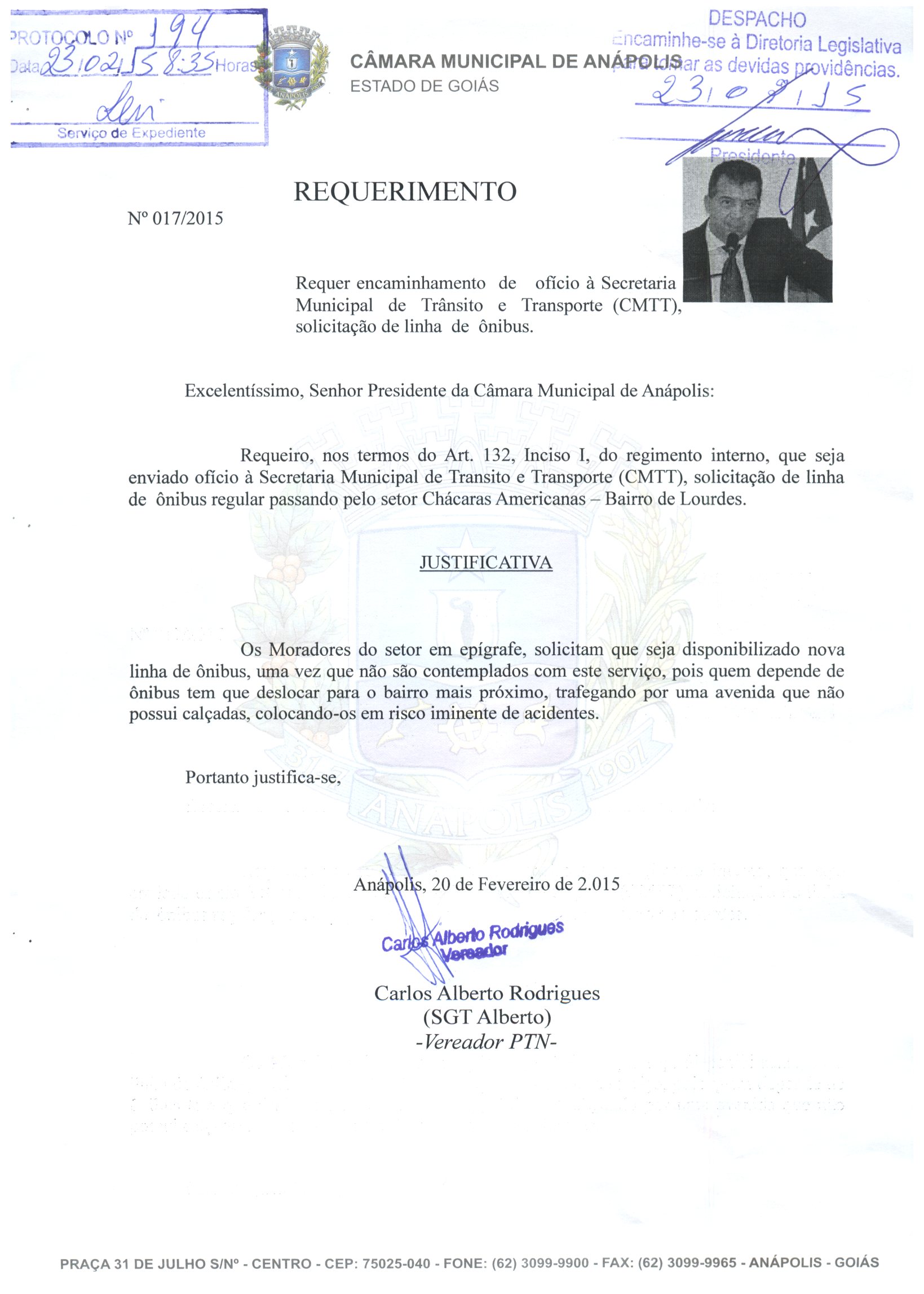 Ementa: REQUEIRO, NOS TERMOS DO ART. 132, INCISO I, DO REGIMENTO INTERNO, QUE SEJA ENVIADO OFÍCIO À SECRETARIA MUNICIPAL DE TRÂNSITO E TRANSPORTE (CMTT), SOLICITAÇÃO DE LINHA DE ÔNIBUS REGULAR PASSANDO PELO SETOR CHÁCARAS AMERICANAS — BAIRRO DE LOURDES.
