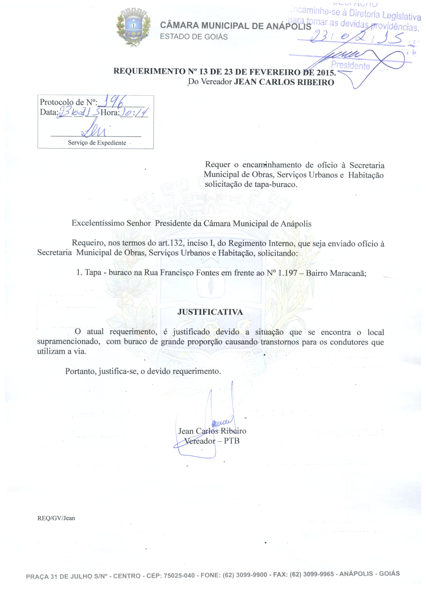 Ementa: REQUEIRO, NOS TERMOS DO ART.132, INCISO I, DO REGIMENTO INTERNO, QUE SEJA ENVIADO OFÍCIO À SECRETARIA MUNICIPAL DE OBRAS, SERVIÇOS URBANOS E HABITAÇÃO, SOLICITANDO: 1. TAPA - BURACO NA RUA FRANCISCO FONTES EM FRENTE AO N° 1.197 — BAIRRO MARACANÃ;
