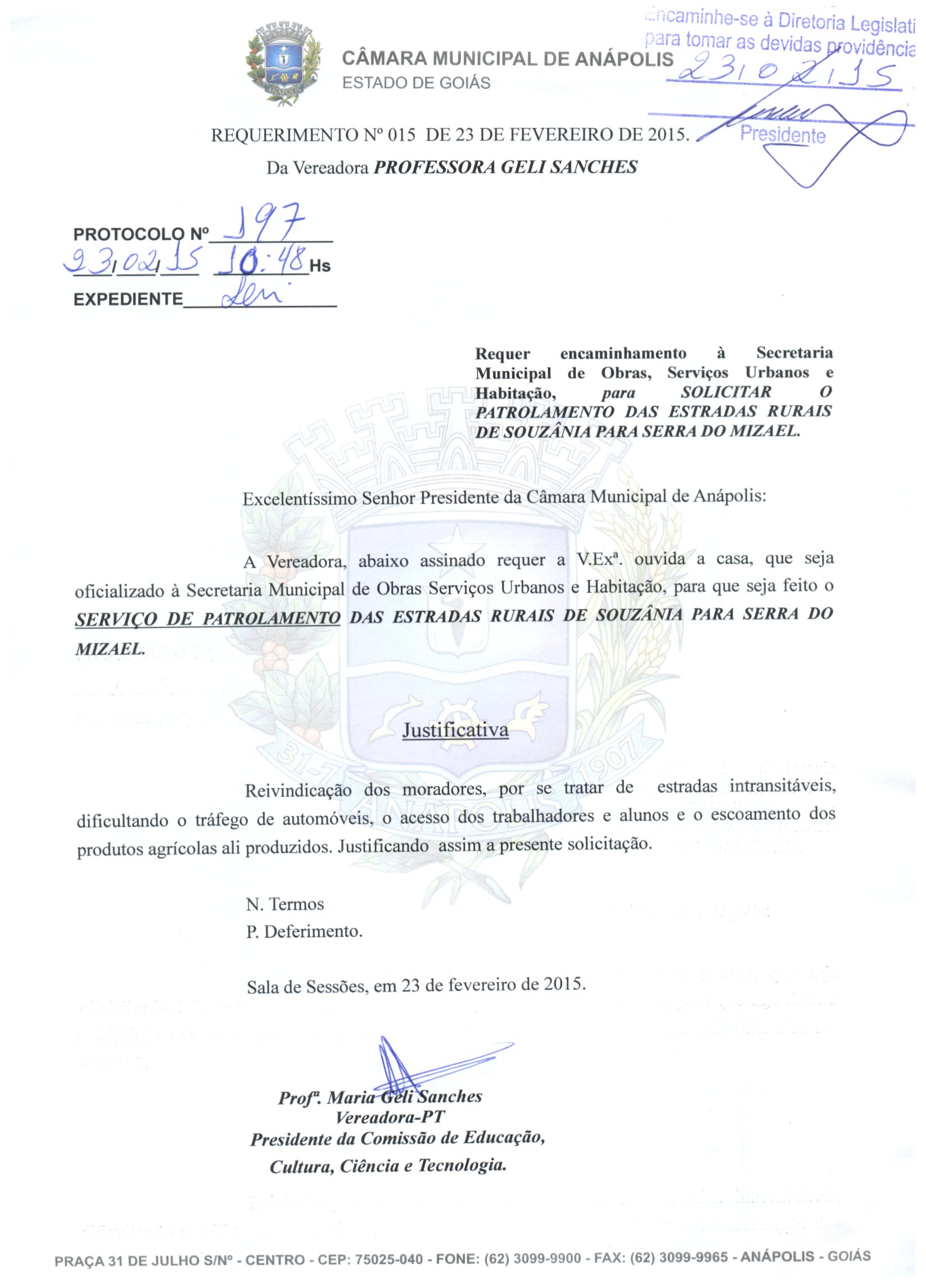 Ementa: A VEREADORA, ABAIXO ASSINADO REQUER A V.EXª. OUVIDA A CASA, QUE SEJA OFICIALIZADO À SECRETARIA MUNICIPAL DE OBRAS SERVIÇOS URBANOS E HABITAÇÃO, PARA QUE SEJA FEITO O SERVICO DE PATROLAMENTO DAS ESTRADAS RURAIS DE SOUZÂNIA PARA SERRA DO MIZAEL.