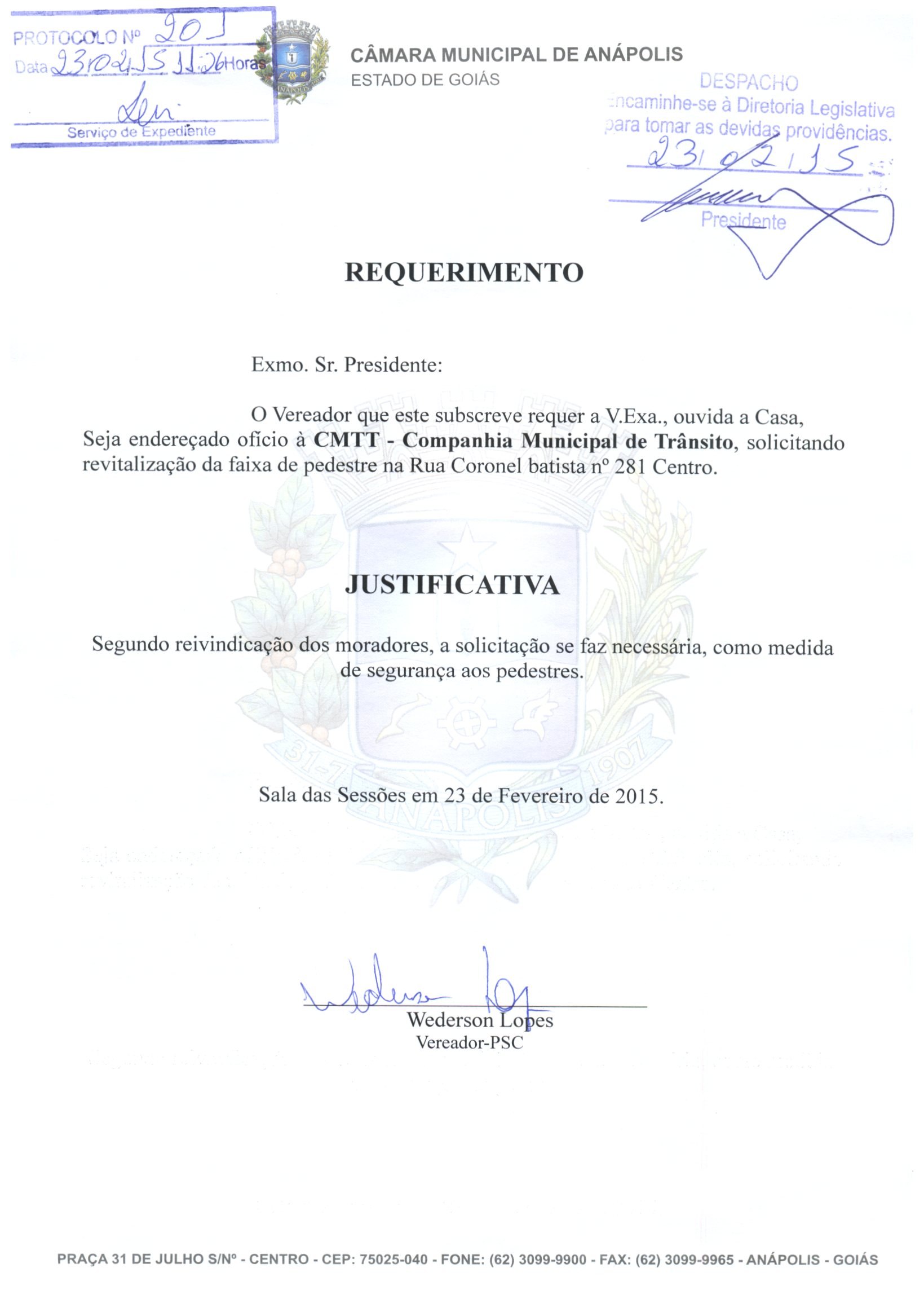 Ementa: O VEREADOR QUE ESTE SUBSCREVE REQUER À V.EXA., OUVIDA A CASA, SEJA ENDEREÇADO OFÍCIO À CMTT - COMPANHIA MUNICIPAL DE TRÂNSITO, SOLICITANDO REVITALIZAÇÃO DA FAIXA DE PEDESTRE NA RUA CORONEL BATISTA N° 281 CENTRO.