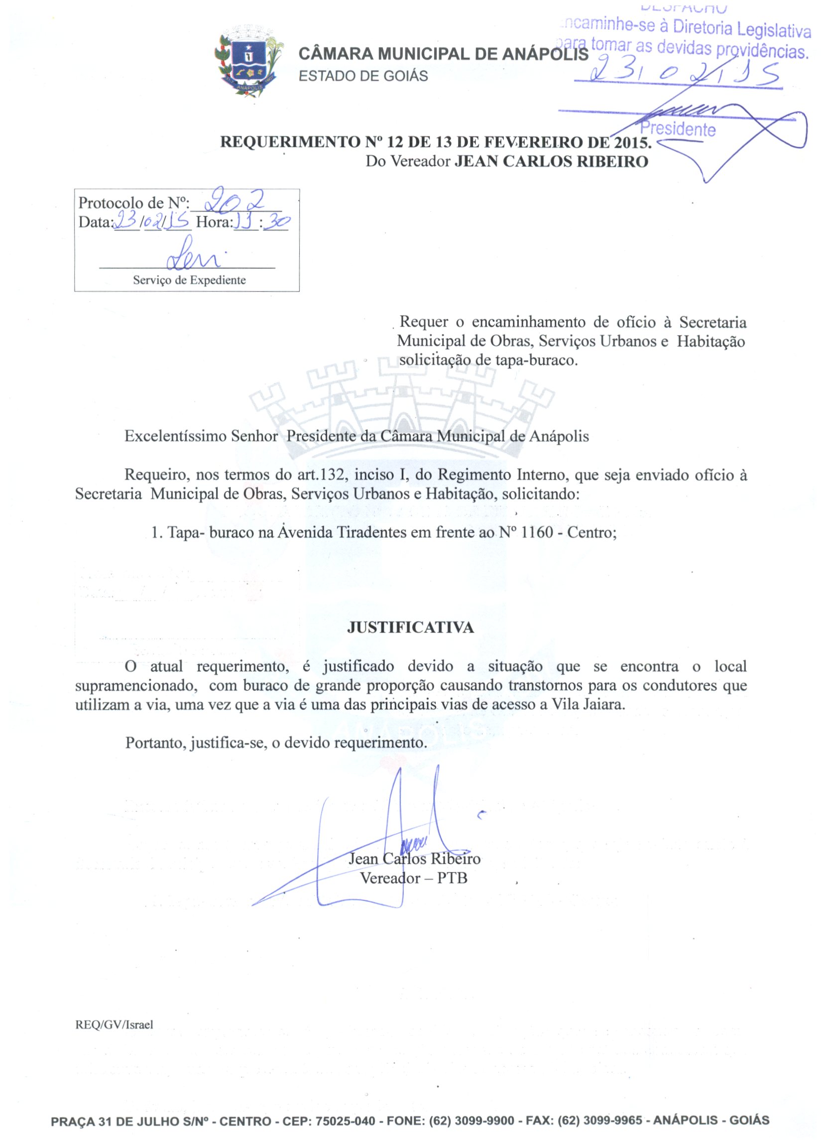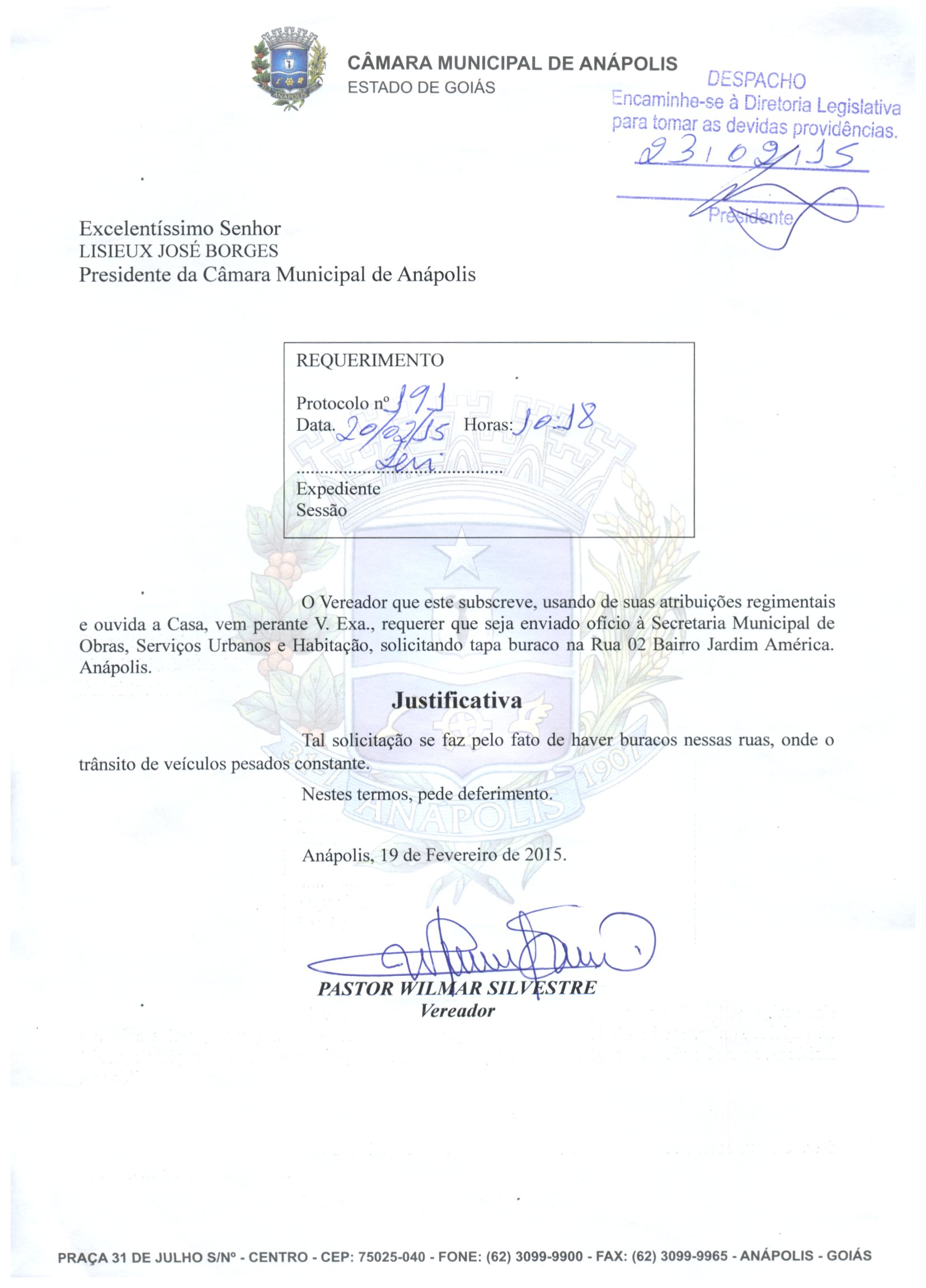 Ementa: O VEREADOR QUE ESTE SUBSCREVE, USANDO DE SUAS ATRIBUIÇÕES REGIMENTAIS E OUVIDA A CASA, VEM PERANTE V. EXA., REQUERER QUE SEJA ENVIADO OFÍCIO À SECRETARIA MUNICIPAL DE OBRAS, SERVIÇOS URBANOS E HABITAÇÃO, SOLICITANDO TAPA BURACO NA RUA 02, BAIRRO JARDIM AMÉRICA. ANÁPOLIS.