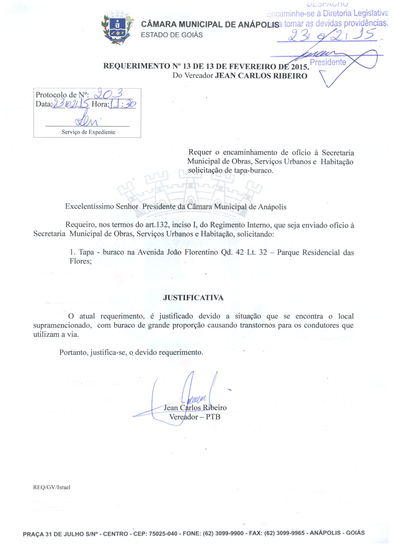 Ementa: REQUEIRO, NOS TERMOS DO ART.132, INCISO I, DO REGIMENTO INTERNO, QUE SEJA ENVIADO OFÍCIO À SECRETARIA MUNICIPAL DE OBRAS, SERVIÇOS URBANOS E HABITAÇÃO, SOLICITANDO: 1. TAPA - BURACO NA AVENIDA JOÃO FLORENTINO, QD. 42, LT. 32 — PARQUE RESIDENCIAL DAS FLORES;