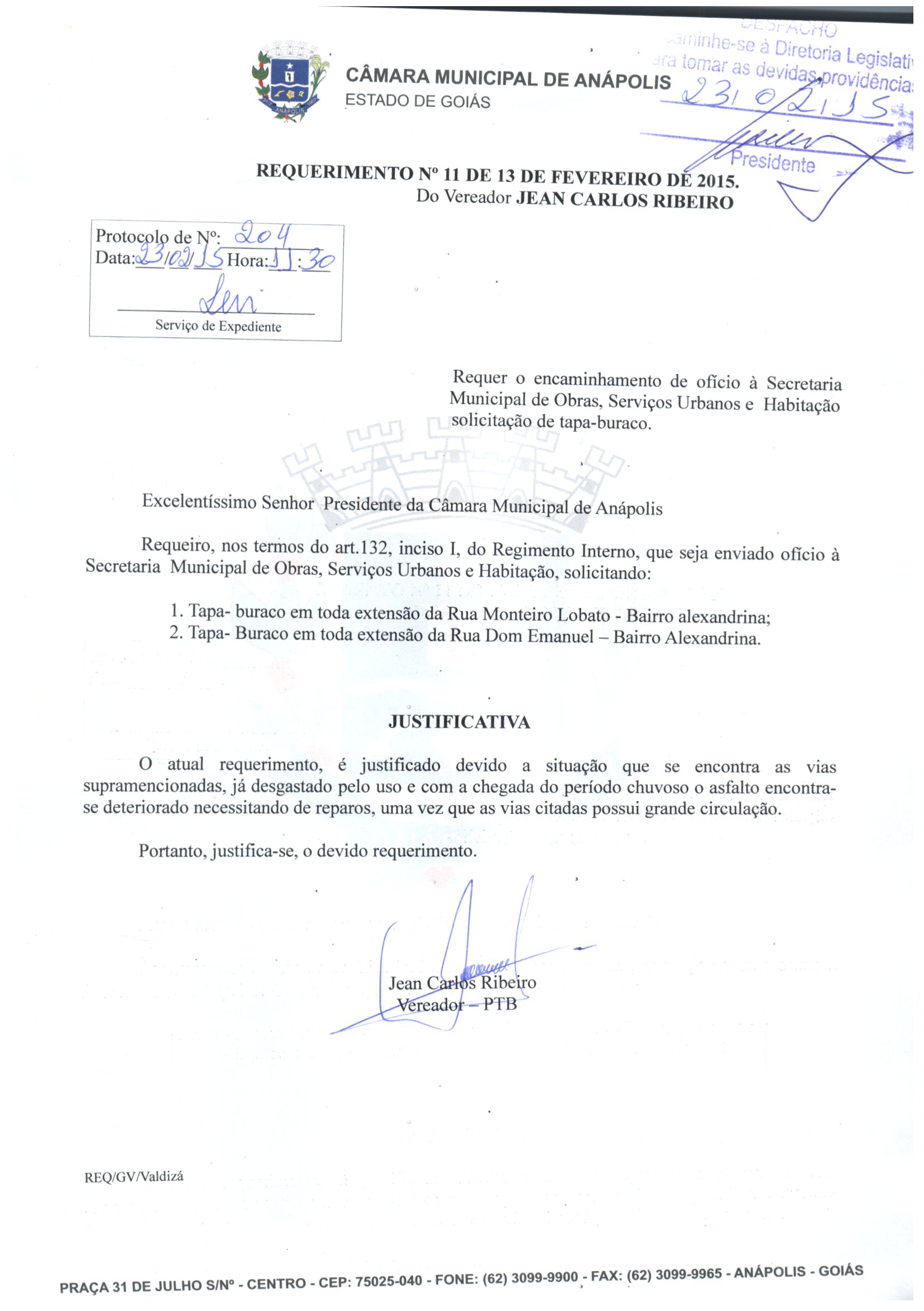 Ementa: REQUEIRO, NOS TERMOS DO ART.132, INCISO I, DO REGIMENTO INTERNO, QUE SEJA ENVIADO OFÍCIO À SECRETARIA MUNICIPAL DE OBRAS, SERVIÇOS URBANOS E HABITAÇÃO, SOLICITANDO: 1. TAPA- BURACO EM TODA EXTENSÃO DA RUA MONTEIRO LOBATO - BAIRRO ALEXANDRINA; 2. TAPA- BURACO EM TODA EXTENSÃO DA RUA DOM EMANUEL — BAIRRO ALEXANDRINA.