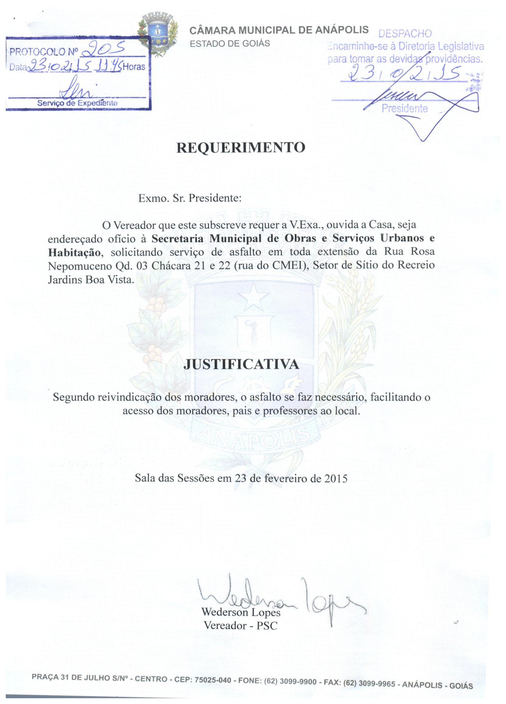Ementa: 0 VEREADOR QUE ESTE SUBSCREVE REQUER A V.EXA., OUVIDA A CASA, SEJA ENDEREÇADO OFÍCIO À SECRETARIA MUNICIPAL DE OBRAS E SERVIÇOS URBANOS E HABITAÇÃO, SOLICITANDO SERVIÇO DE ASFALTO EM TODA EXTENSÃO DA RUA ROSA NEPOMUCENO, QD. 03, CHÁCARA 21 E 22 (RUA DO CMEI), SETOR DE SÍTIO DO RECREIO JARDIM BOA VISTA.