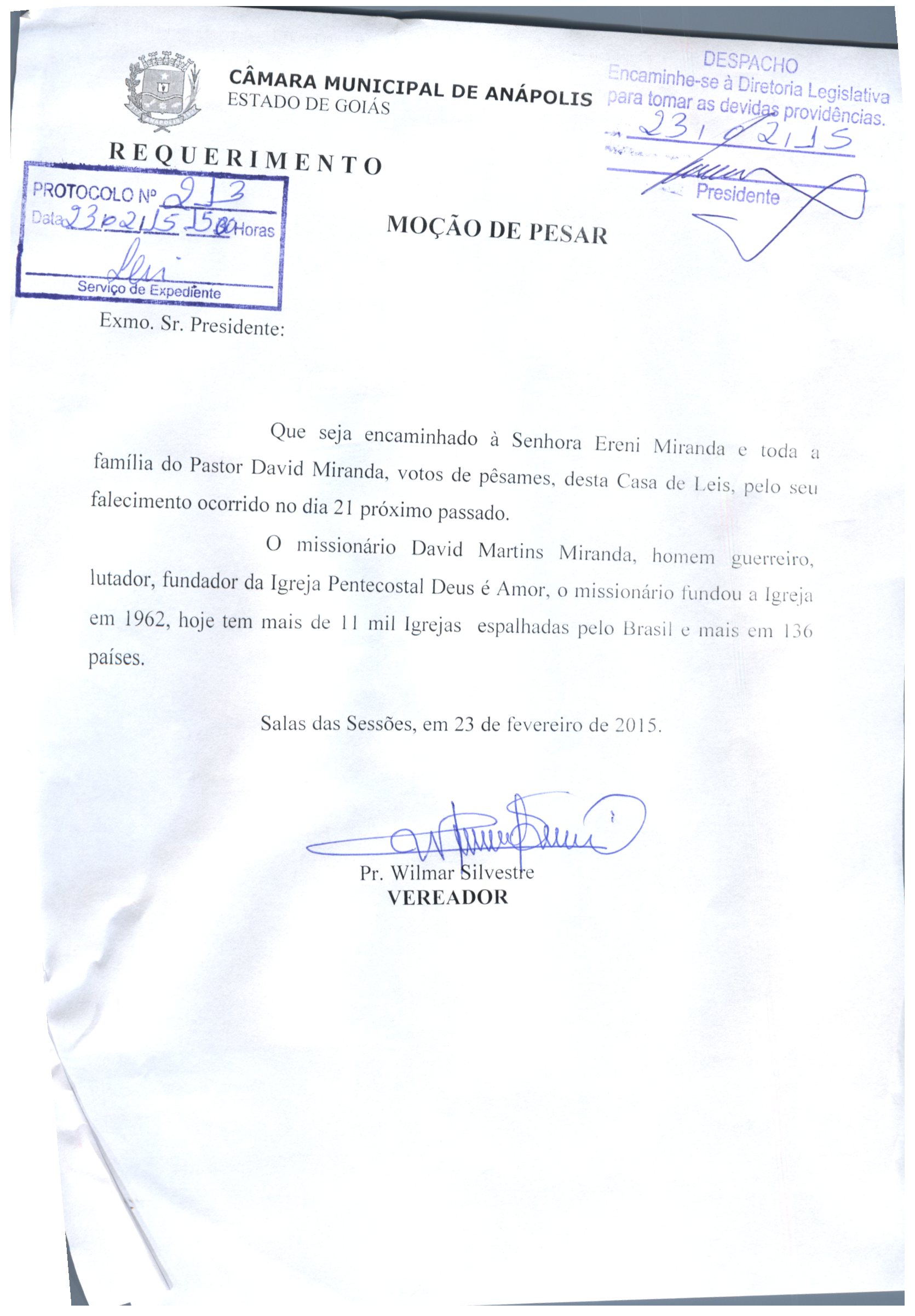 Ementa: QUE SEJA ENCAMINHADO À SENHORA ERENI MIRANDA E TODA A FAMÍLIA DO PASTOR DAVID MIRANDA, VOTOS DE PÊSAMES, DESTA CASA DE LEIS, PELO SEU FALECIMENTO OCORRIDO NO DIA 21 PRÓXIMO PASSADO. O MISSIONÁRIO DAVID MARTINS MIRANDA, HOMEM GUERREIRO, LUTADOR, FUNDADOR DA IGREJA PENTECOSTAL DEUS É AMOR, O MISSIONÁRIO FUNDOU LGREJA EM 1962, HOJE TEM MAIS DE 11 MIL IGREJAS ESPALHADAS PELO BRASIL E MAIS EM L36 PAÍSES.