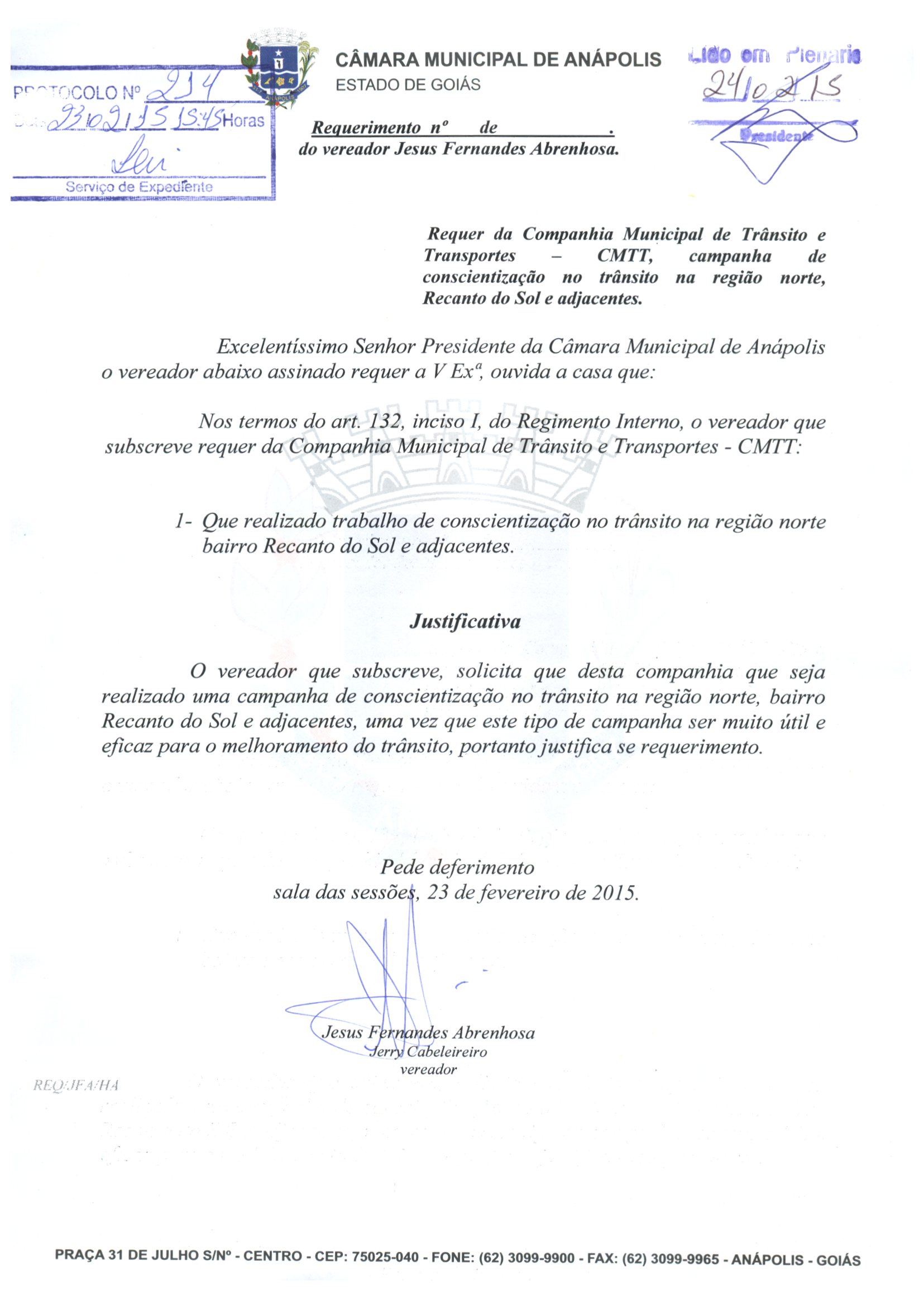 Ementa: NOS TERMOS DO ART. 132, INCISO I, DO REGIMENTO INTERNO, O VEREADOR QUE SUBSCREVE REQUER DA COMPANHIA MUNICIPAL DE TRÂNSITO E TRANSPORTES - CMTT: 1- QUE SEJA REALIZADO TRABALHO DE CONSCIENTIZAÇÃO NO TRÂNSITO NA REGIÃO NORTE, BAIRRO RECANTO DO SOL E ADJACENTES.