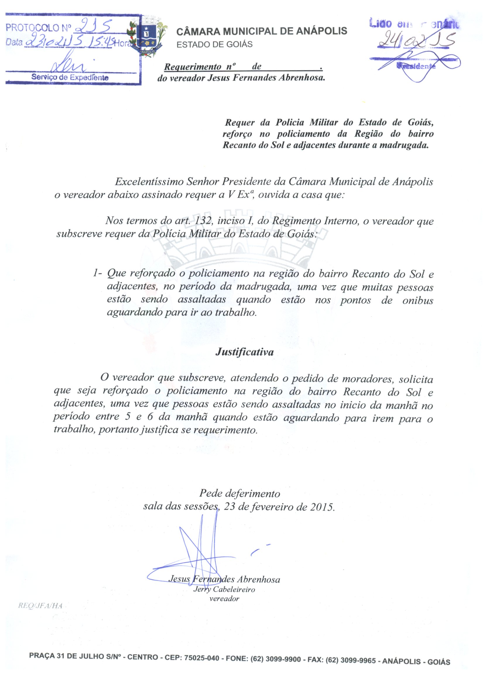 Ementa: NOS TERMOS DO ART. 132, INCISO I, DO REGIMENTO INTERNO, O VEREADOR QUE SUBSCREVE REQUER DA POLÍCIA MILITAR DO ESTADO DE GOIÁS: 1- QUE SEJA REFORÇADO O POLICIAMENTO NA REGIÃO DO BAIRRO RECANTO DO SOL E ADJACENTES, NO PERÍODO DA MADRUGADA, UMA VEZ QUE MUITAS PESSOAS ESTÃO SENDO ASSALTADAS QUANDO ESTÃO NOS PONTOS DE ÔNIBUS AGUARDANDO PARA IR AO TRABALHO.