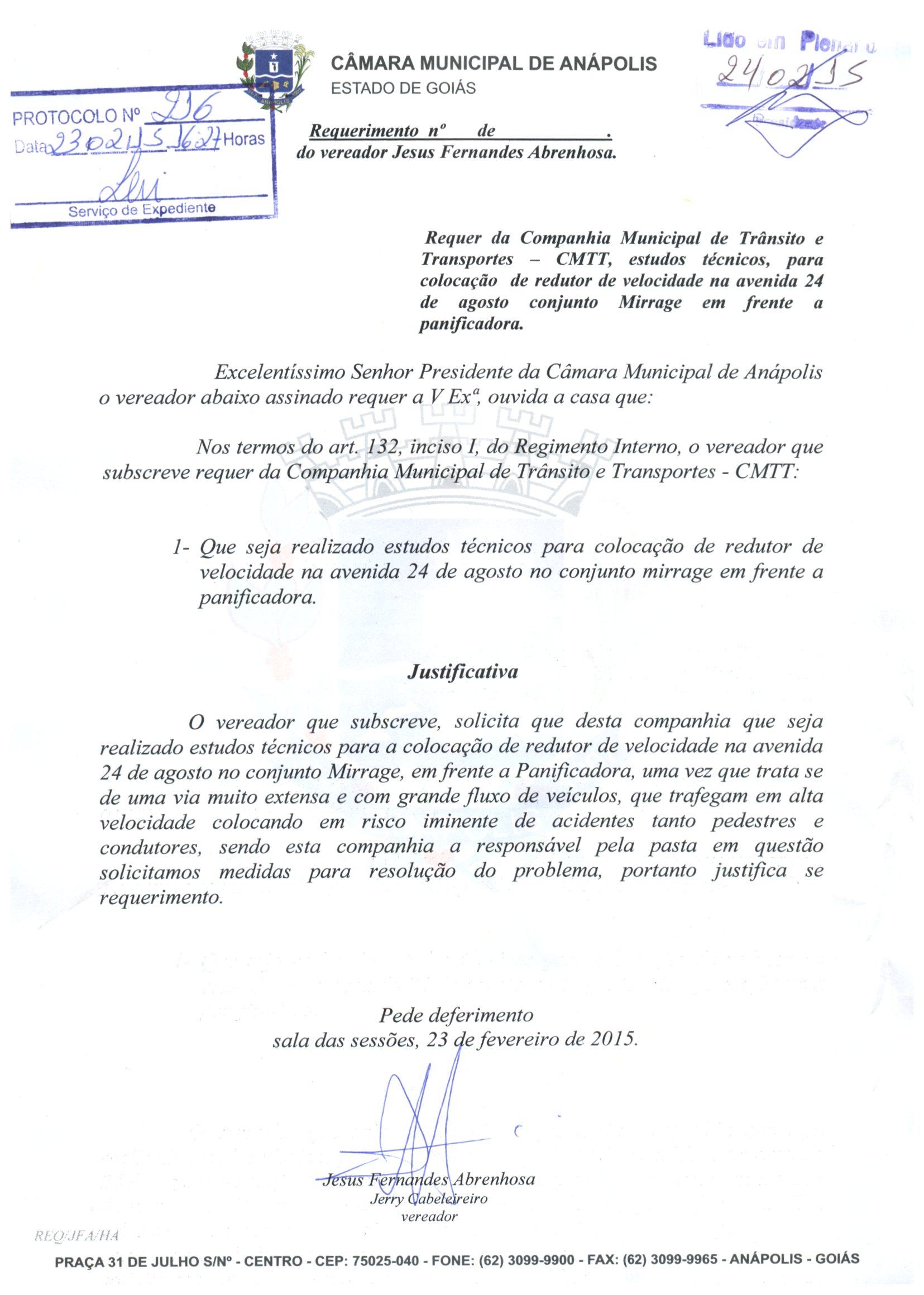 Ementa: NOS TERMOS DO ART. 132, INCISO I, DO REGIMENTO INTERNO, O VEREADOR QUE SUBSCREVE REQUER DA COMPANHIA MUNICIPAL DE TRÂNSITO E TRANSPORTES - CMTT: 1- QUE SEJA REALIZADO ESTUDOS TÉCNICOS PARA COLOCAÇÃO DE REDUTOR DE VELOCIDADE NA AVENIDA 24 DE AGOSTO NO CONJUNTO MIRAGE EM FRENTE A PANIFICADORA.