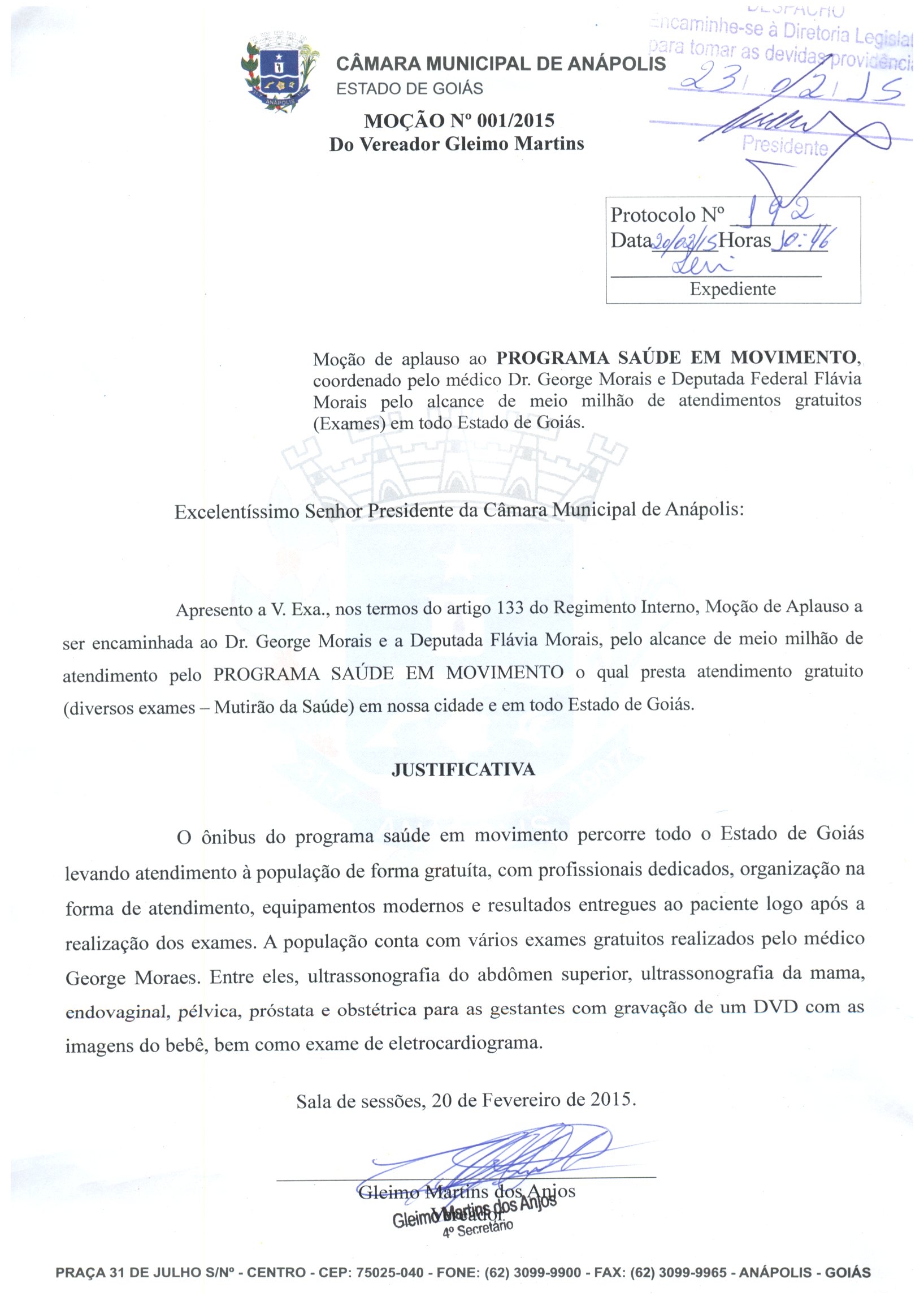 Ementa: APRESENTO À V. EXA., NOS TERMOS DO ARTIGO 133 DO REGIMENTO INTERNO, MOÇÃO DE APLAUSO A SER ENCAMINHADA AO DR. GEORGE MORAIS E A DEPUTADA FLÁVIA MORAIS, PELO ALCANCE DE MEIO MILHÃO DE ATENDIMENTO PELO PROGRAMA SAÚDE EM MOVIMENTO O QUAL PRESTA ATENDIMENTO GRATUITO (DIVERSOS EXAMES — MUTIRÃO DA SAÚDE) EM NOSSA CIDADE E EM TODO ESTADO DE GOIÁS.