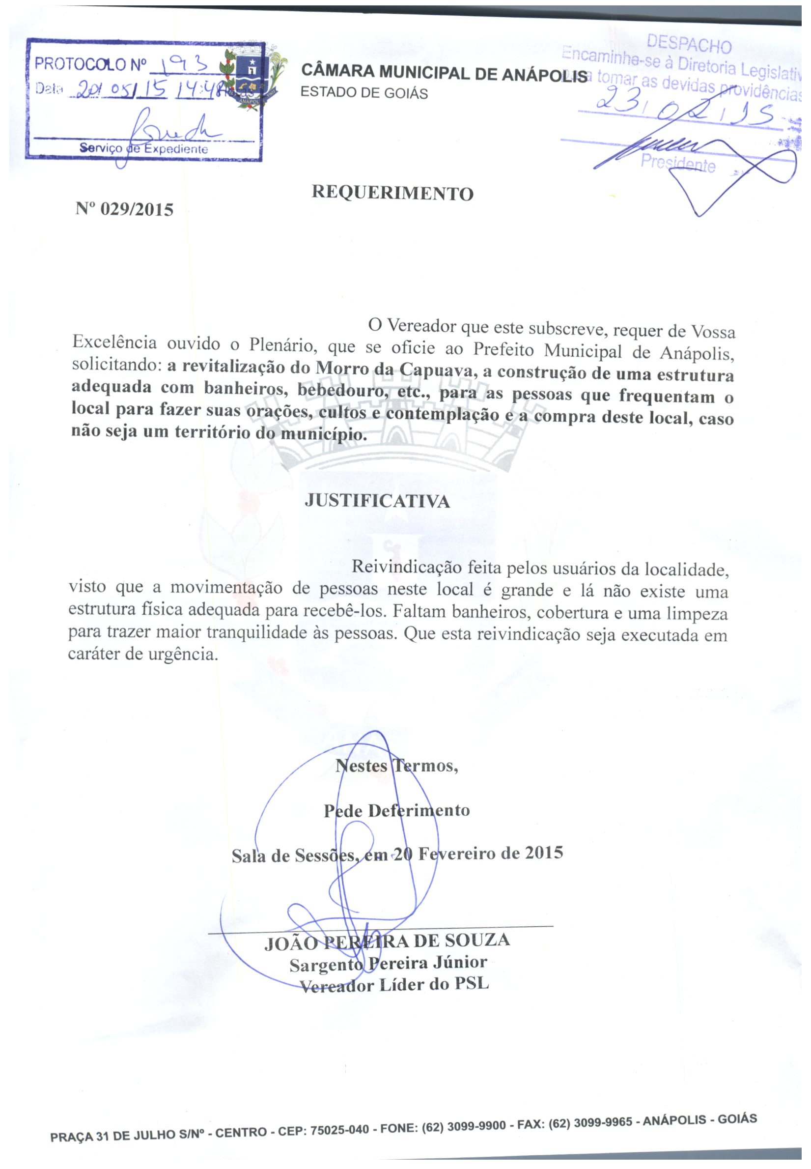 Ementa: 0 VEREADOR QUE ESTE SUBSCREVE, REQUER DE VOSSA EXCELÊNCIA OUVIDO O PLENÁRIO, QUE SE OFICIE AO PREFEITO MUNICIPAL DE ANÁPOLIS, SOLICITANDO: A REVITALIZAÇÃO DO MORRO DA CAPUAVA, A CONSTRUÇÃO DE UMA ESTRUTURA ADEQUADA COM BANHEIROS, BEBEDOURO, ETC., PARA AS PESSOAS QUE FREQUENTAM O LOCAL PARA FAZER SUAS ORAÇÕES, CULTOS E CONTEMPLAÇÃO E A COMPRA DESTE LOCAL, CASO NÃO SEJA UM TERRITÓRIO DO MUNICÍPIO.