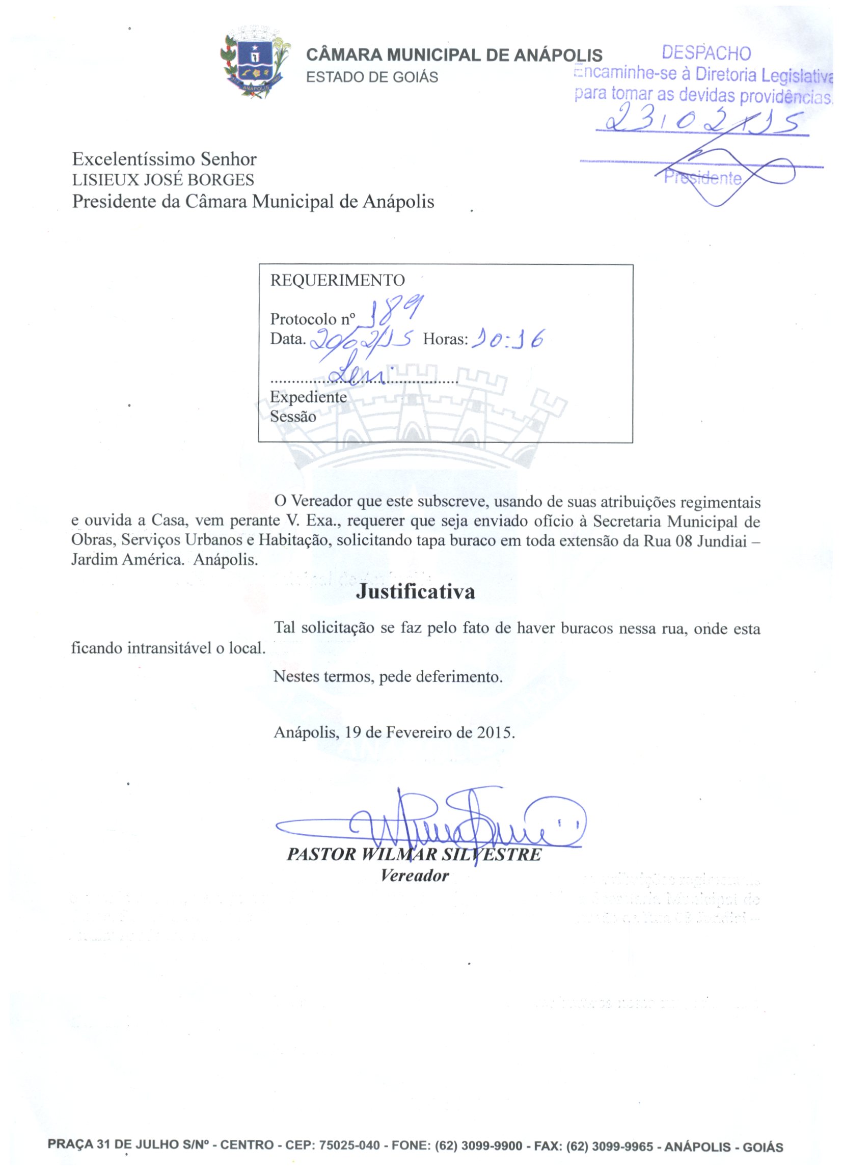 Ementa: O VEREADOR QUE ESTE SUBSCREVE, USANDO DE SUAS ATRIBUIÇÕES REGIMENTAIS E OUVIDA A CASA, VEM PERANTE V. EXA., REQUERER QUE SEJA ENVIADO OFÍCIO À SECRETARIA MUNICIPAL DE OBRAS, SERVIÇOS URBANOS E HABITAÇÃO, SOLICITANDO TAPA BURACO EM TODA EXTENSÃO DA RUA 08 JUNDIAÍ — JARDIM AMÉRICA. ANÁPOLIS.