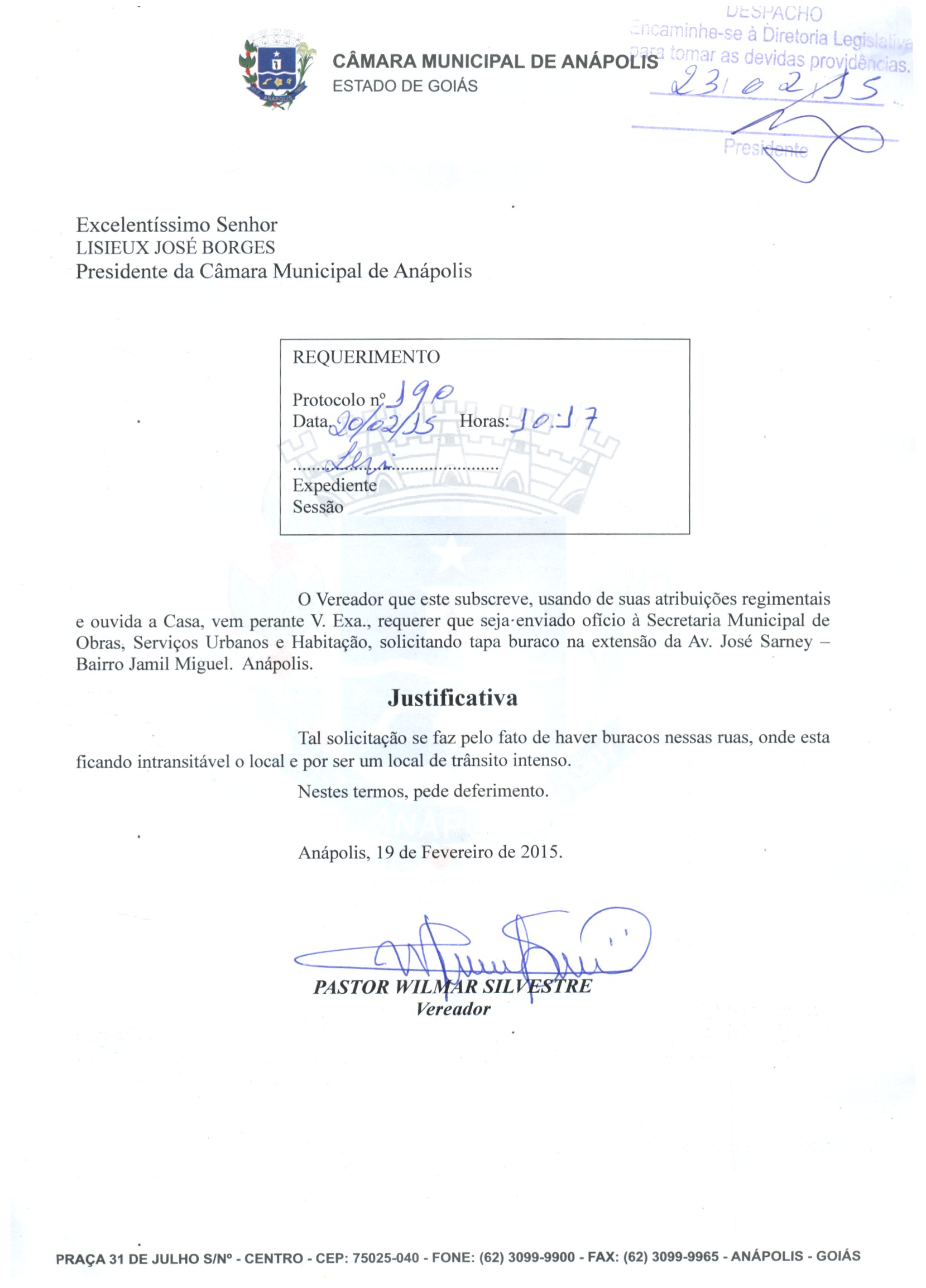 Ementa: O VEREADOR QUE ESTE SUBSCREVE, USANDO DE SUAS ATRIBUIÇÕES REGIMENTAIS E OUVIDA A CASA, VEM PERANTE V. EXA., REQUERER QUE SEJA ENVIADO OFÍCIO À SECRETARIA MUNICIPAL DE OBRAS, SERVIÇOS URBANOS E HABITAÇÃO, SOLICITANDO TAPA BURACO NA EXTENSÃO DA AV. JOSE SARNEY — BAIRRO JAMIL MIGUEL. ANÁPOLIS.