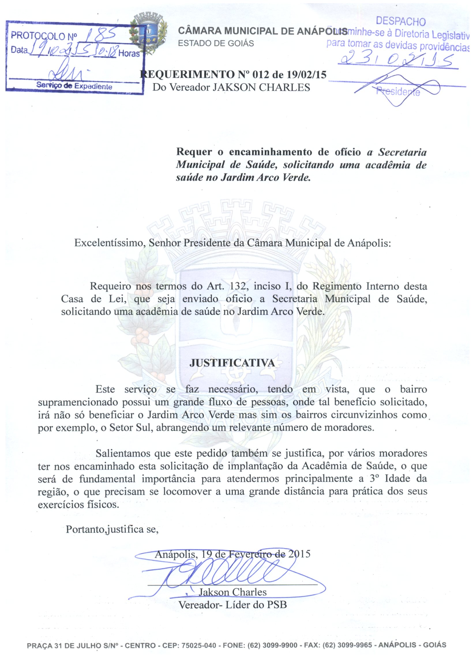 Ementa: REQUEIRO NOS TERMOS DO ART. 132, INCISO I, DO REGIMENTO INTERNO DESTA CASA DE LEI, QUE SEJA ENVIADO OFÍCIO À SECRETARIA MUNICIPAL DE SAÚDE, SOLICITANDO UMA ACADEMIA DE SAÚDE NO JARDIM ARCO VERDE.