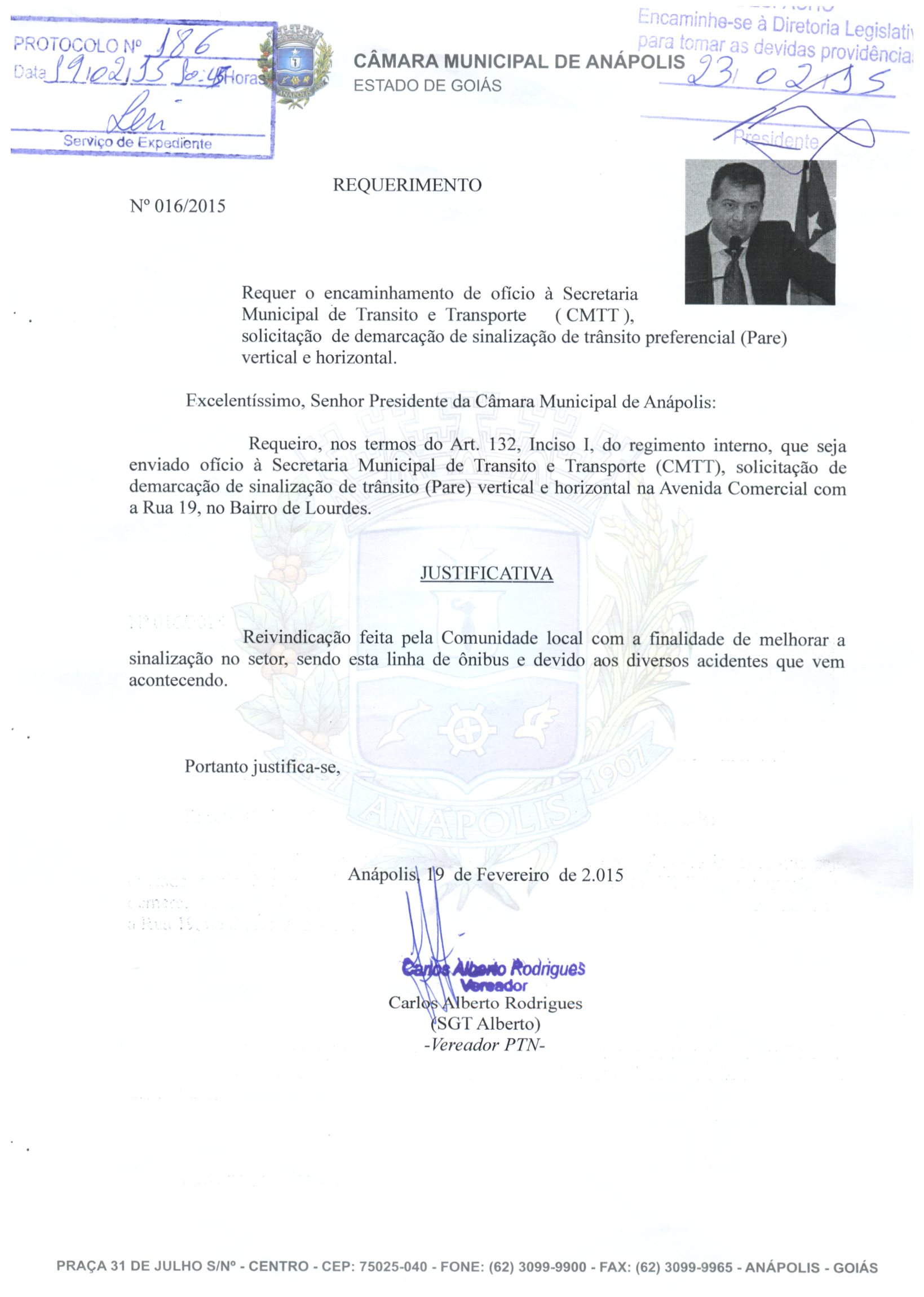 Ementa: REQUEIRO, NOS TERMOS DO ART. 132, INCISO I, DO REGIMENTO INTERNO, QUE SEJA ENVIADO OFÍCIO À SECRETARIA MUNICIPAL DE TRÂNSITO E TRANSPORTE (CMTT), SOLICITAÇÃO DE DEMARCAÇÃO DE SINALIZAÇÃO DE TRÂNSITO (PARE) VERTICAL E HORIZONTAL NA AVENIDA COMERCIAL COM A RUA 19, NO BAIRRO DE LOURDES.