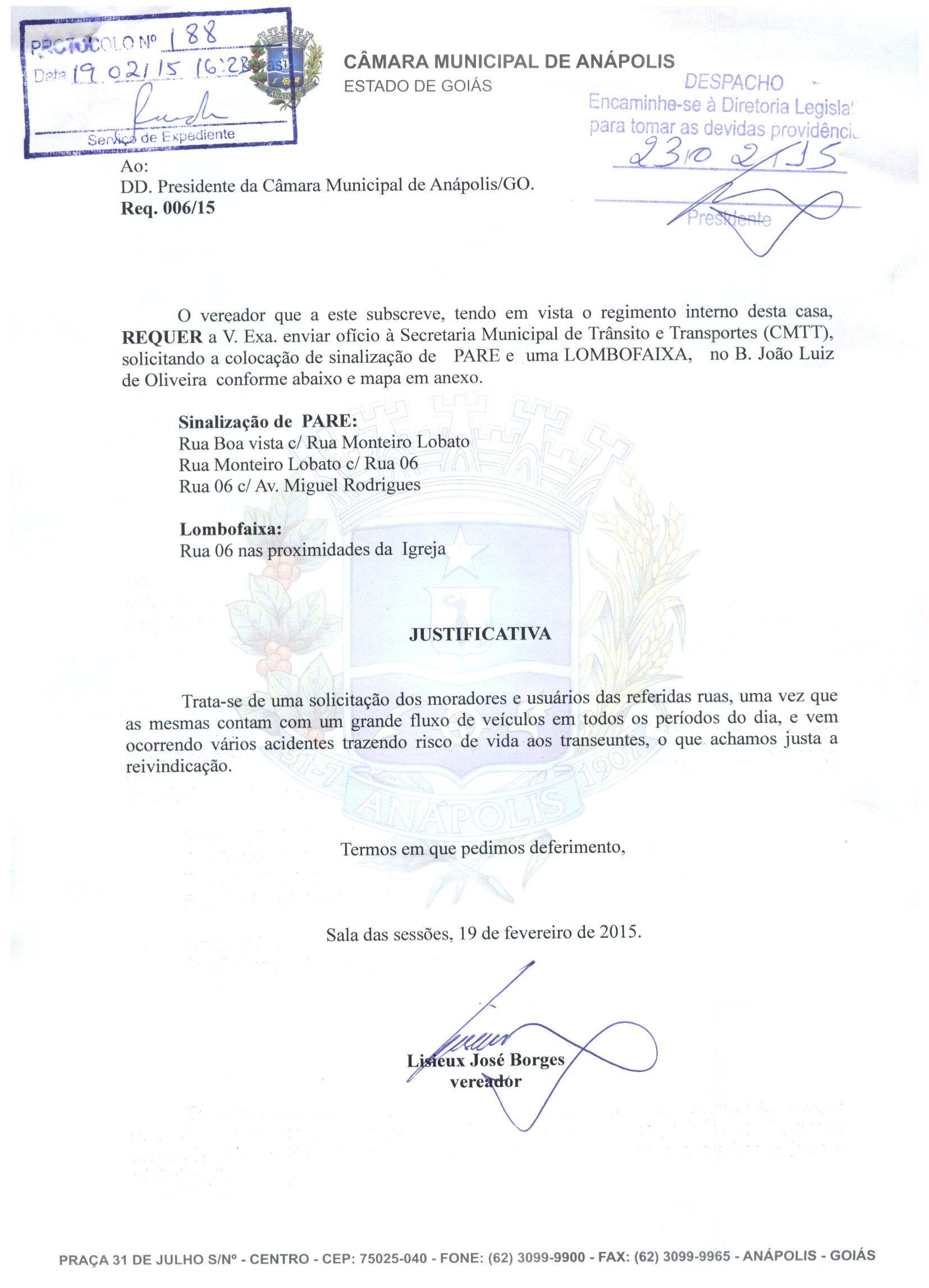 Ementa: O VEREADOR QUE A ESTE SUBSCREVE, TENDO EM VISTA O REGIMENTO INTERNO DESTA CASA, REQUER A V. EXA. ENVIAR OFÍCIO À SECRETARIA MUNICIPAL DE TRÂNSITO E TRANSPORTES (CMTT), SOLICITANDO A COLOCAÇÃO DE SINALIZAÇÃO DE PARE E UMA LOMBOFAIXA, NO B. JOÃO LUIZ DE OLIVEIRA CONFORME ABAIXO E MAPA EM ANEXO. SINALIZAÇÃO DE PARE: RUA BOA VISTA C/ RUA MONTEIRO LOBATO RUA MONTEIRO LOBATO C/ RUA 06 RUA 06 C/ AV. MIGUEL RODRIGUES LOMBOFAIXA: RUA 06 NAS PROXIMIDADES DA IGREJA
