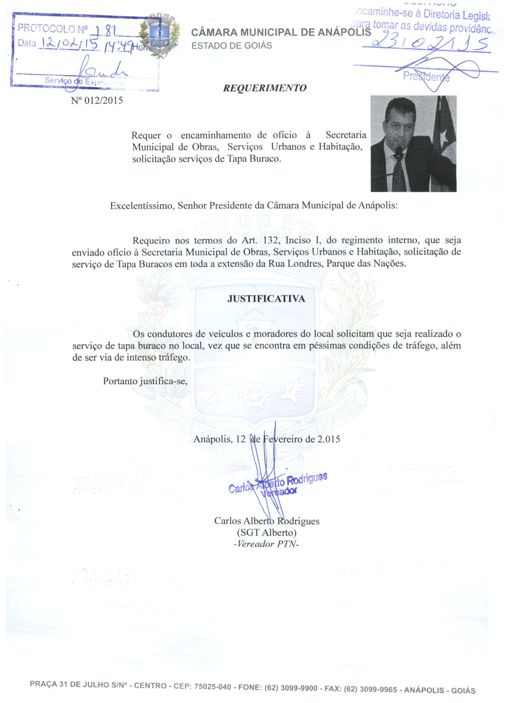 Ementa: REQUEIRO NOS TERMOS DO ART. 132, INCISO I, DO REGIMENTO INTERNO, QUE SEJA ENVIADO OFÍCIO À SECRETARIA MUNICIPAL DE OBRAS, SERVIÇOS URBANOS E HABITAÇÃO, SOLICITAÇÃO DE SERVIÇO DE TAPA BURACOS EM TODA A EXTENSÃO DA RUA LONDRES, PARQUE DAS NAÇÕES.