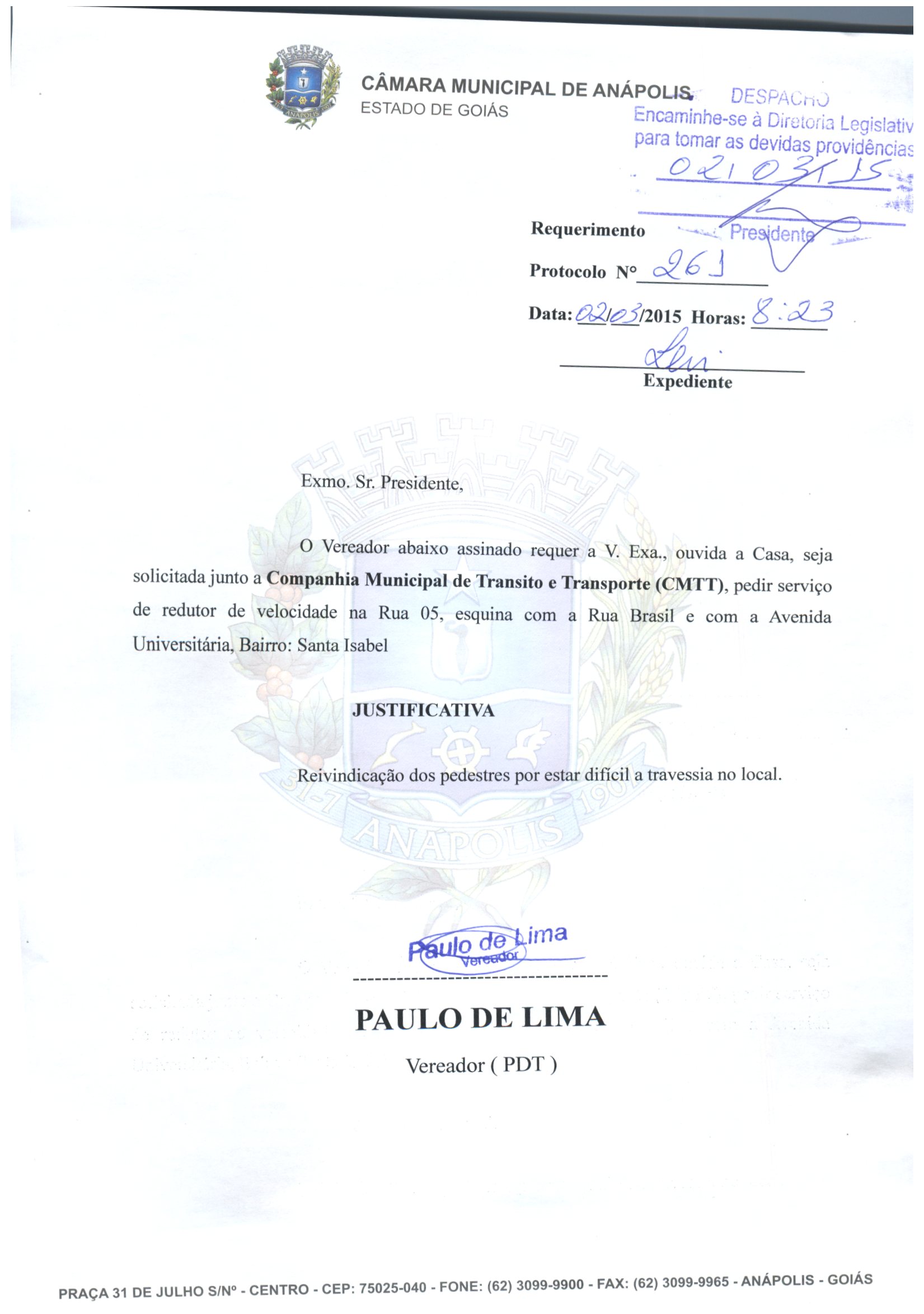 Ementa: O VEREADOR ABAIXO ASSINADO REQUER À V. EXA., OUVIDA A CASA, SEJA SOLICITADA JUNTO À COMPANHIA MUNICIPAL DE TRÂNSITO E TRANSPORTE (CMTT), PEDIR SERVIÇO DE REDUTOR DE VELOCIDADE NA RUA 05, ESQUINA COM A RUA BRASIL E COM A AVENIDA UNIVERSITÁRIA, BAIRRO: SANTA ISABEL.