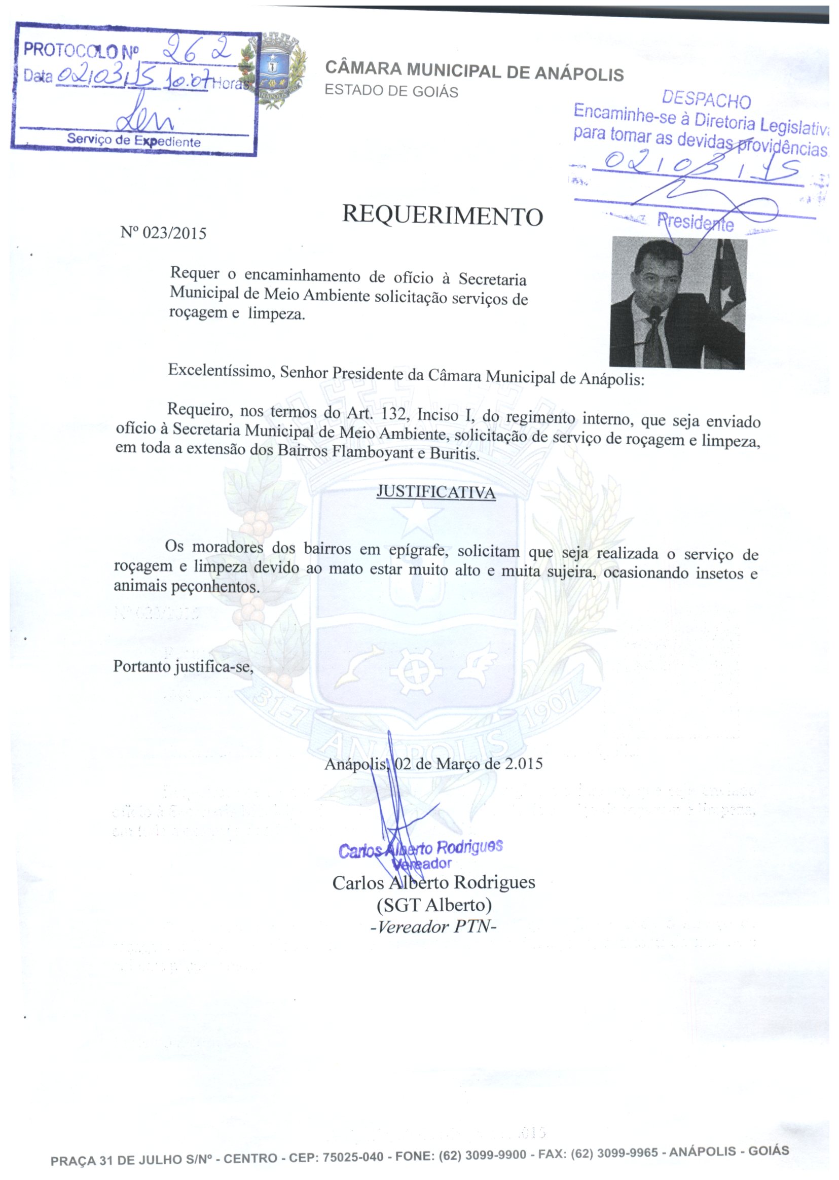 Ementa: REQUEIRO, NOS TERMOS DO ART. 132, INCISO I, DO REGIMENTO INTERNO, QUE SEJA ENVIADO OFÍCIO À SECRETARIA MUNICIPAL DE MEIO AMBIENTE, SOLICITAÇÃO DE SERVIÇO DE ROÇAGEM E LIMPEZA, EM TODA A EXTENSÃO DOS BAIRROS FLAMBOYANT E BURITIS.