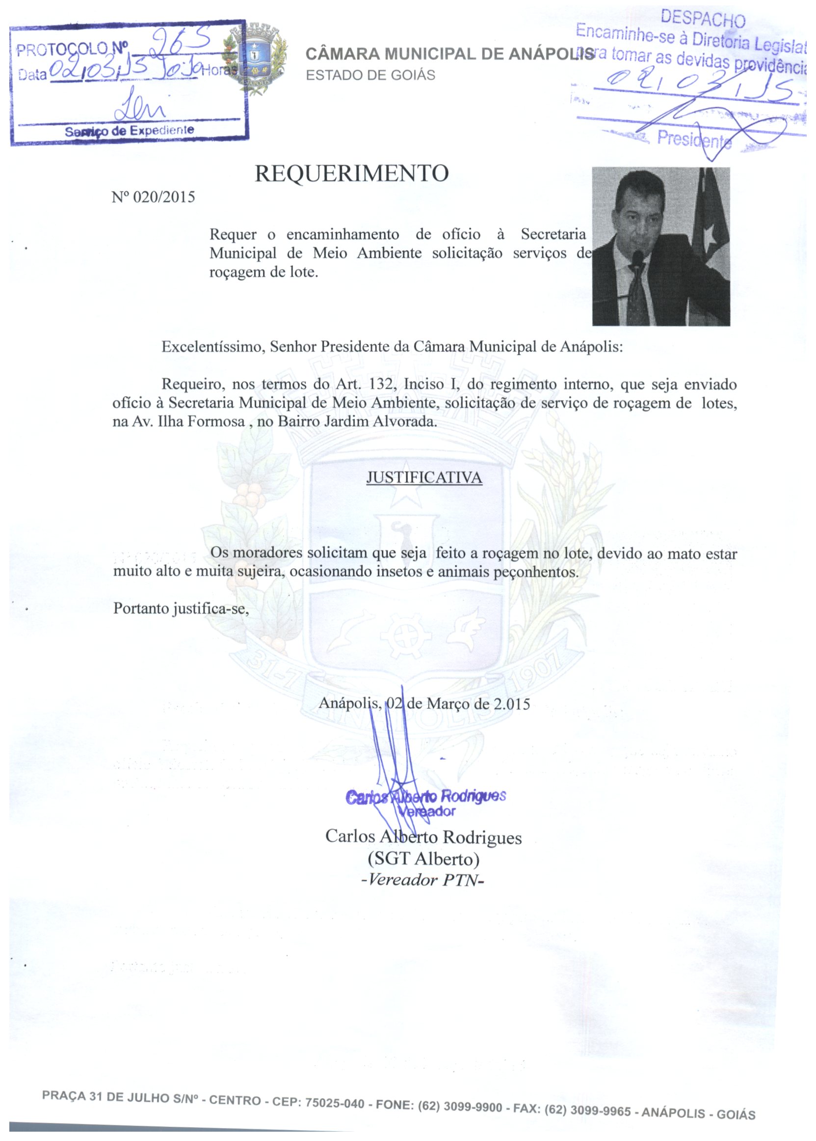 Ementa: REQUEIRO, NOS TERMOS DO ART. 132, INCISO I, DO REGIMENTO INTERNO, QUE SEJA ENVIADO OFÍCIO À SECRETARIA MUNICIPAL DE MEIO AMBIENTE, SOLICITAÇÃO DE SERVIÇO DE ROÇAGEM DE LOTES, NA AV. ILHA FORMOSA , NO BAIRRO JARDIM ALVORADA.