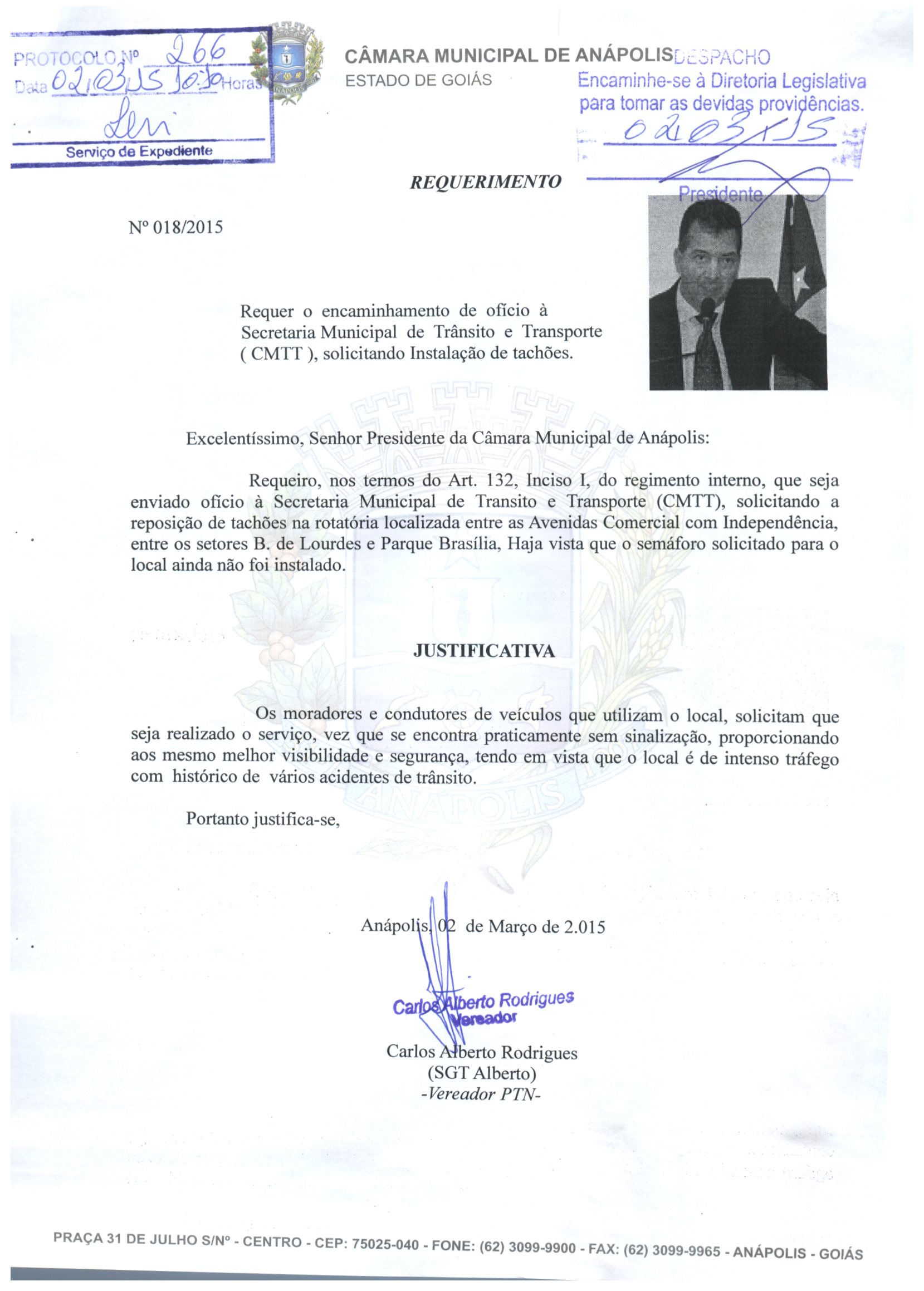Ementa: REQUEIRO, NOS TERMOS DO ART. 132, INCISO I, DO REGIMENTO INTERNO, QUE SEJA ENVIADO OFÍCIO À SECRETARIA MUNICIPAL DE TRÂNSITO E TRANSPORTE (CMTT), SOLICITANDO A REPOSIÇÃO DE TACHÕES NA ROTATÓRIA LOCALIZADA ENTRE AS AVENIDAS COMERCIAL COM INDEPENDÊNCIA, ENTRE OS SETORES B. DE LOURDES E PARQUE BRASÍLIA, HAJA VISTA QUE O SEMÁFORO SOLICITADO PARA O LOCAL AINDA NÃO FOI INSTALADO.