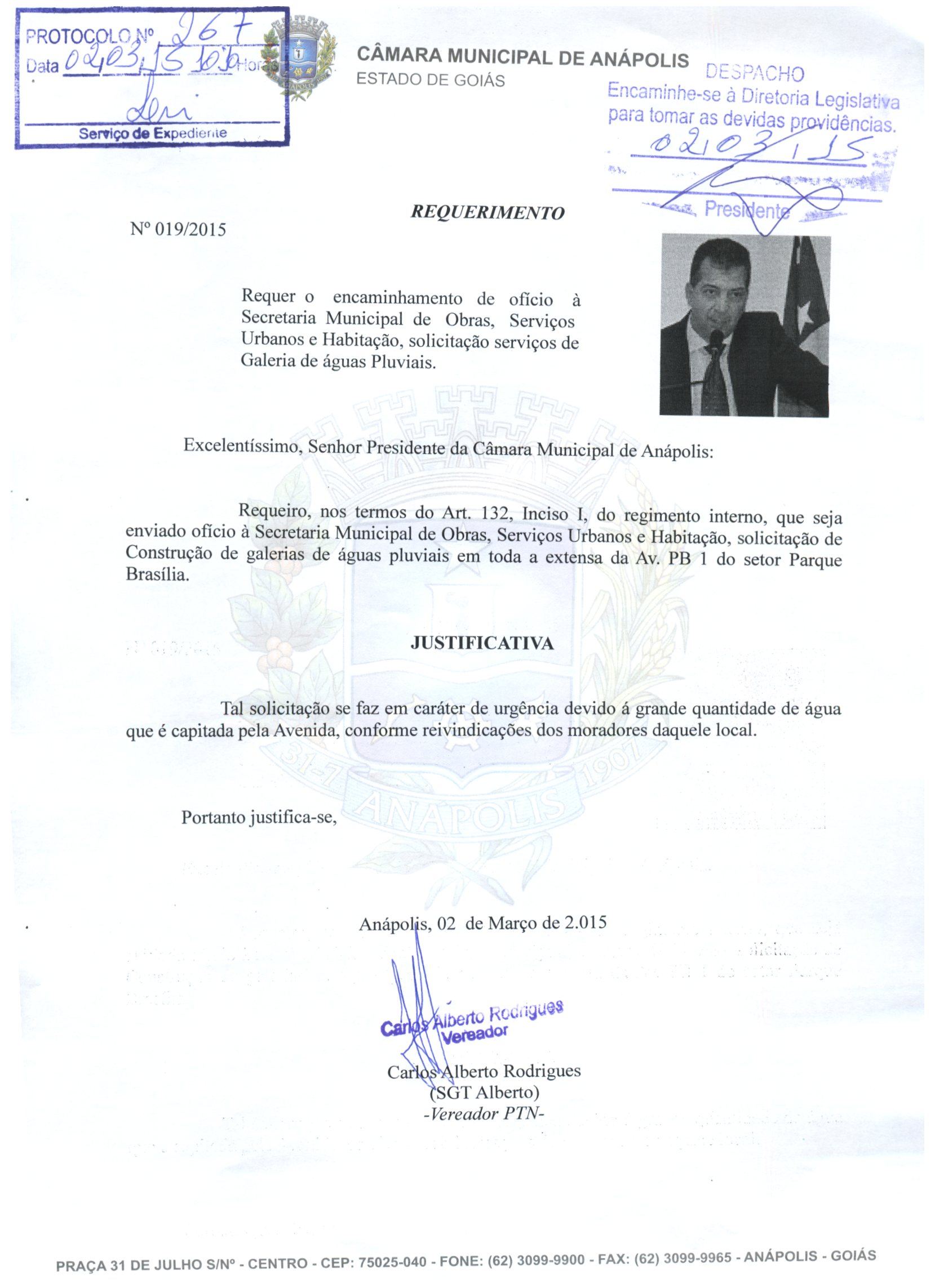 Ementa: REQUEIRO, NOS TERMOS DO ART. 132, INCISO I, DO REGIMENTO INTERNO, QUE SEJA ENVIADO OFÍCIO À SECRETARIA MUNICIPAL DE OBRAS, SERVIÇOS URBANOS E HABITAÇÃO, SOLICITAÇÃO DE CONSTRUÇÃO DE GALERIAS DE ÁGUAS PLUVIAIS EM TODA A EXTENSÃO DA AV. PB 1 DO SETOR PARQUE BRASÍLIA.
