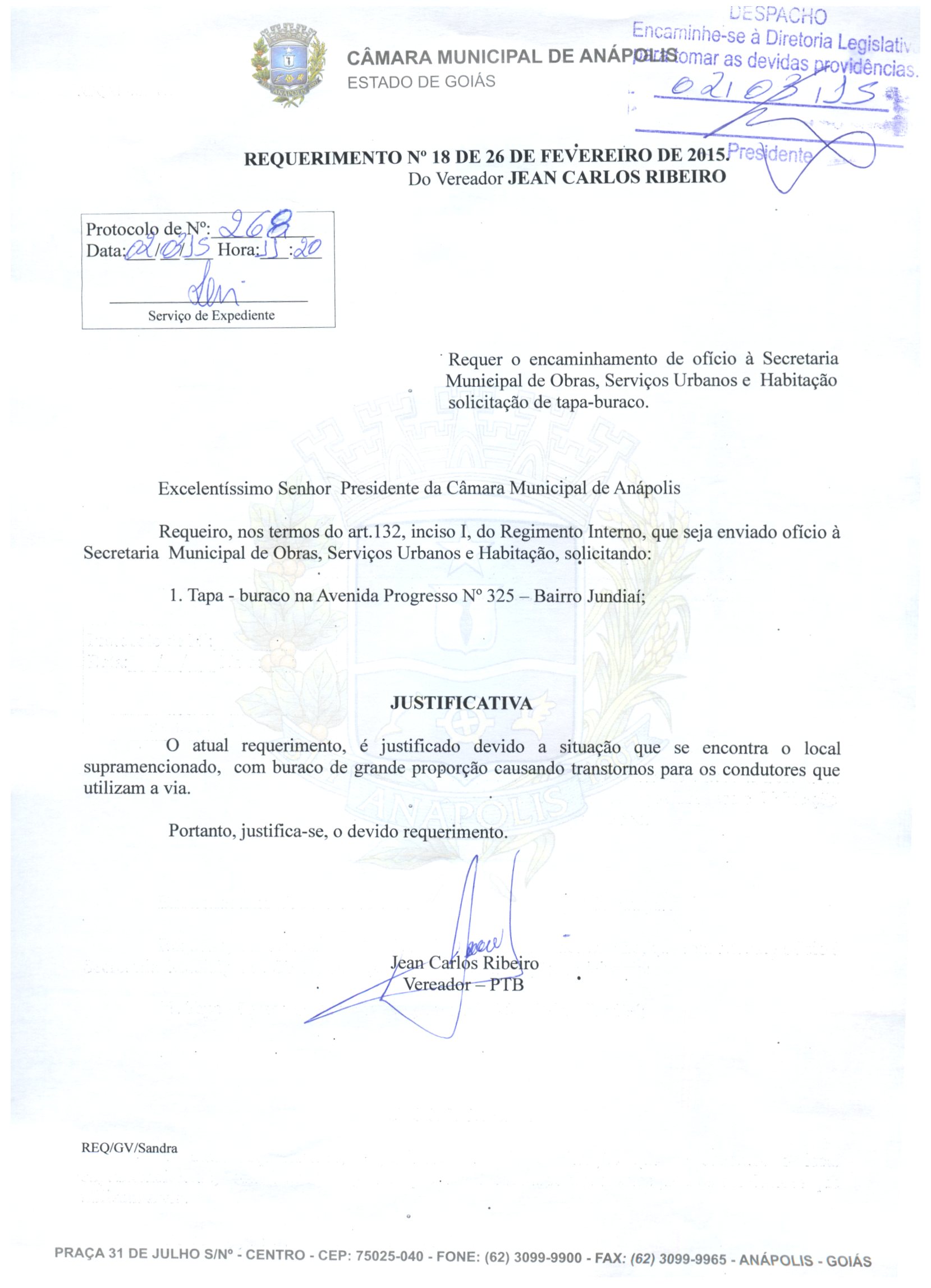 Ementa: REQUEIRO, NOS TERMOS DO ART.132, INCISO I, DO REGIMENTO INTERNO, QUE SEJA ENVIADO OFÍCIO À SECRETARIA MUNICIPAL DE OBRAS, SERVIÇOS URBANOS E HABITAÇÃO, SOLICITANDO: 1. TAPA - BURACO NA AVENIDA PROGRESSO, N° 325 — BAIRRO JUNDIAÍ;