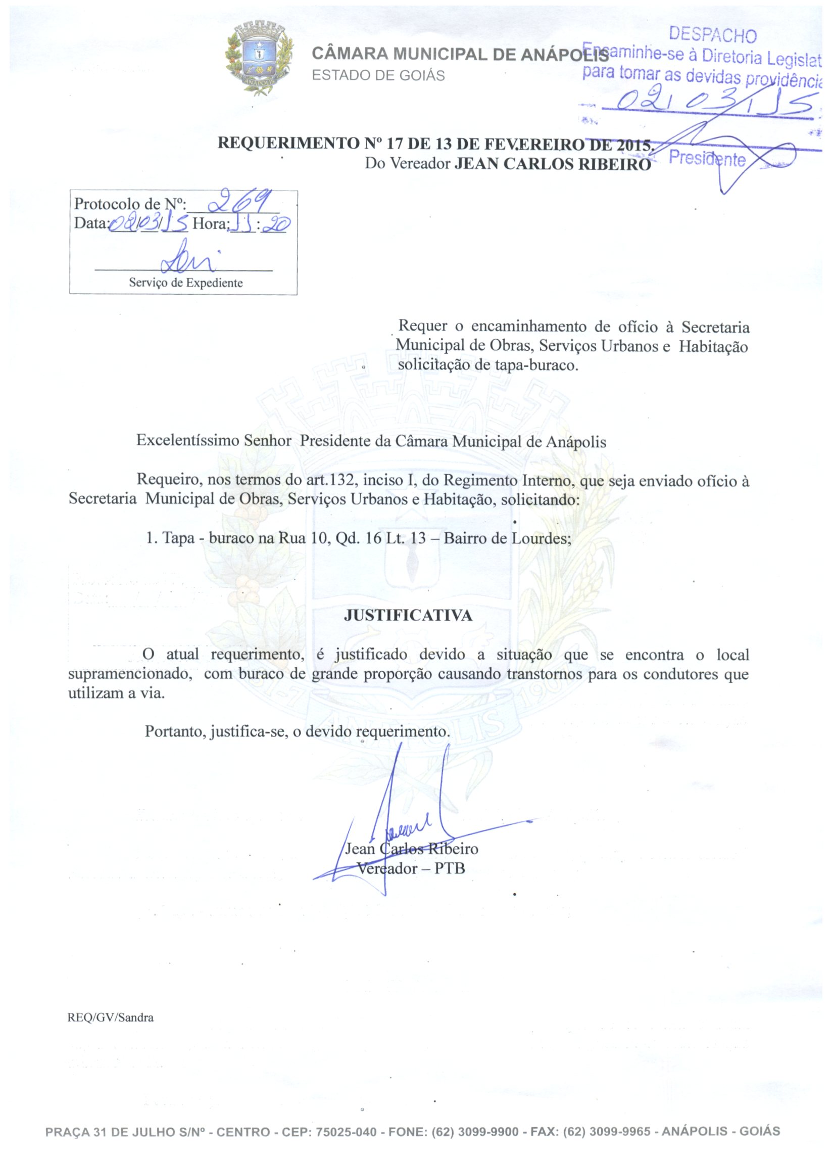 Ementa: REQUEIRO, NOS TERMOS DO ART.132, INCISO I, DO REGIMENTO INTERNO, QUE SEJA ENVIADO OFÍCIO À SECRETARIA MUNICIPAL DE OBRAS, SERVIÇOS URBANOS E HABITAÇÃO, SOLICITANDO: 1. TAPA - BURACO NA RUA 10, QD. 16, LT. 13 — BAIRRO DE LOURDES;