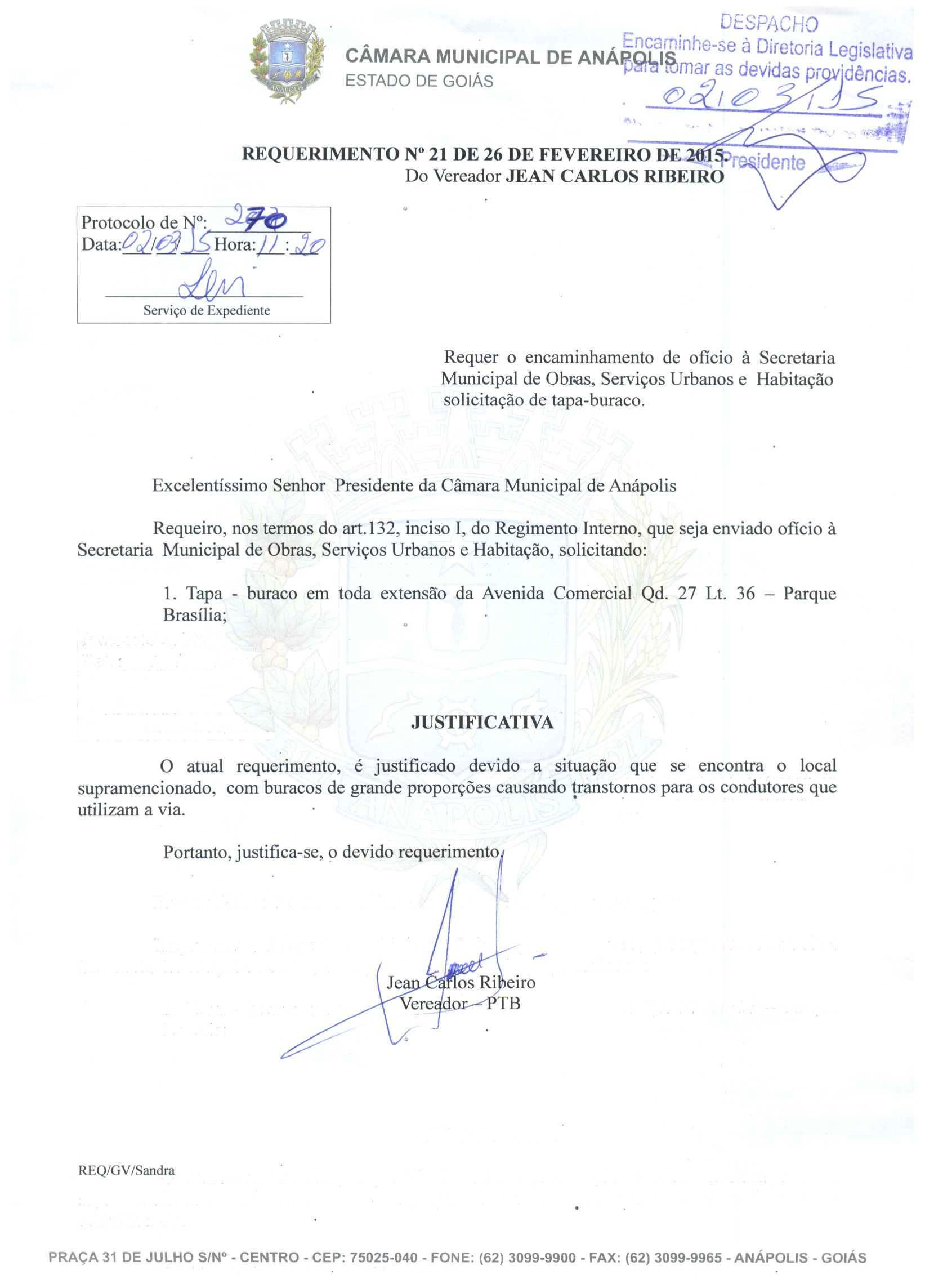Ementa: REQUEIRO, NOS TERMOS DO ART.132, INCISO I, DO REGIMENTO INTERNO, QUE SEJA ENVIADO OFÍCIO À SECRETARIA MUNICIPAL DE OBRAS, SERVIÇOS URBANOS E HABITAÇÃO, SOLICITANDO: 1. TAPA - BURACO EM TODA EXTENSÃO DA AVENIDA COMERCIAL, QD. 27, LT. 36 — PARQUE BRASÍLIA.