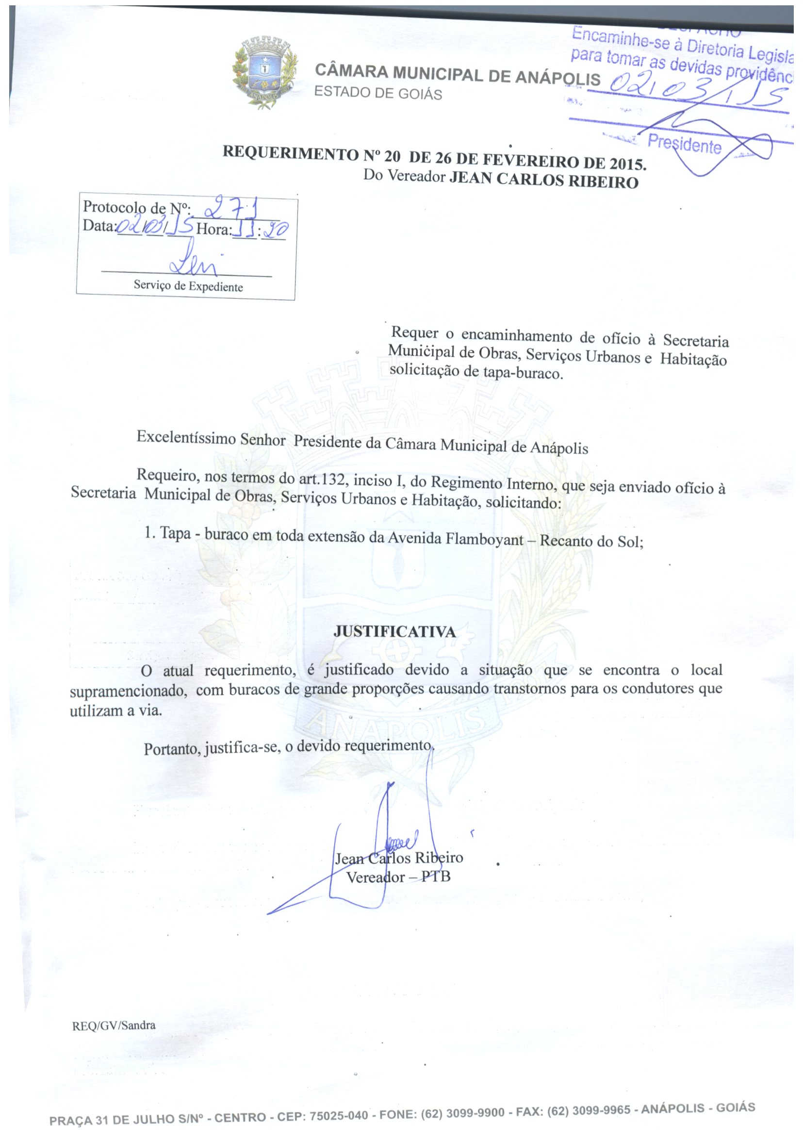 Ementa: REQUEIRO, NOS TERMOS DO ART.132, INCISO I, DO REGIMENTO INTERNO, QUE SEJA ENVIADO OFÍCIO À SECRETARIA MUNICIPAL DE OBRAS, SERVIÇOS URBANOS E HABITAÇÃO, SOLICITANDO: 1. TAPA - BURACO EM TODA EXTENSÃO DA AVENIDA FLAMBOYANT — RECANTO DO SOL.