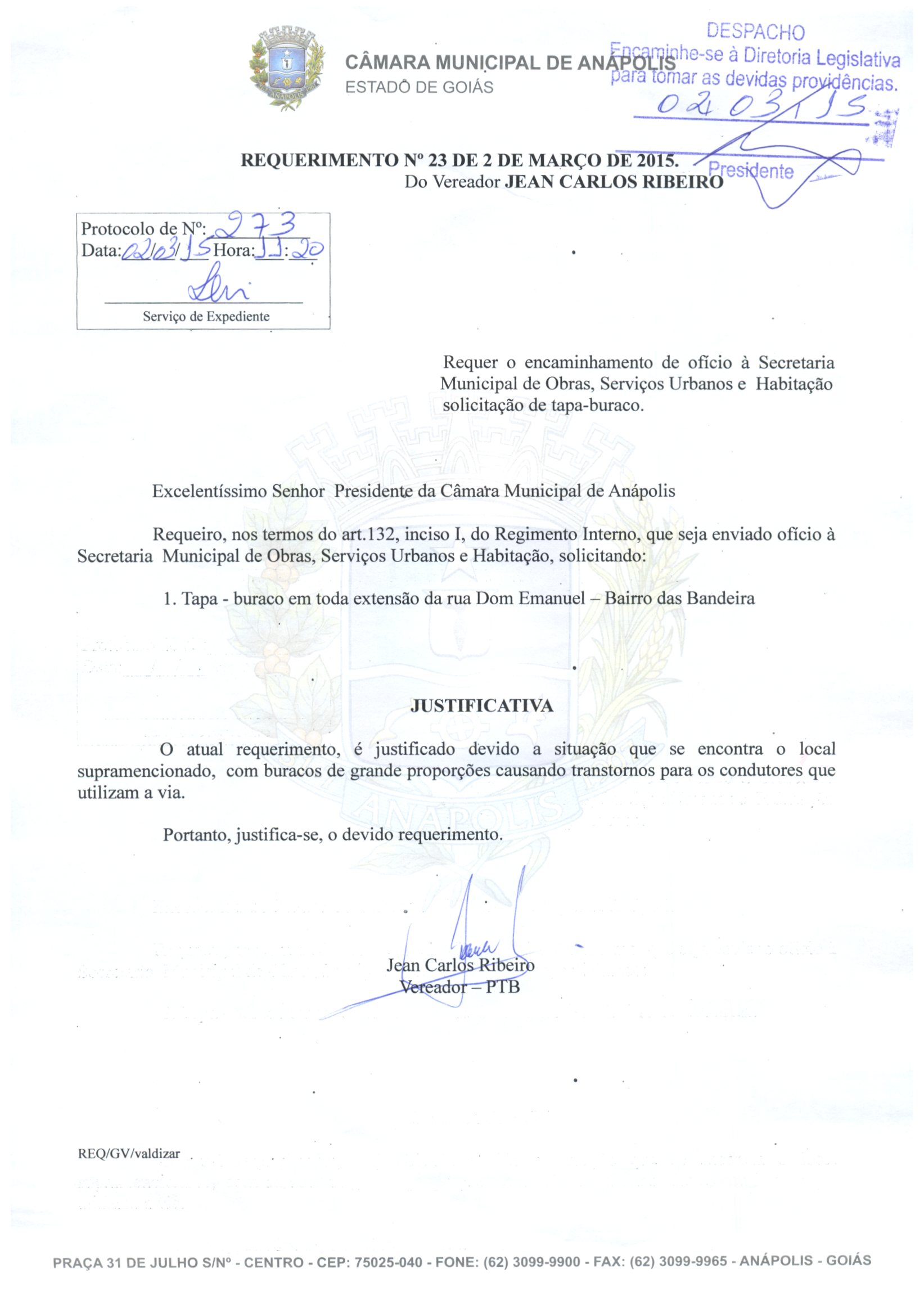 Ementa: REQUEIRO, NOS TERMOS DO ART.132, INCISO I, DO REGIMENTO INTERNO, QUE SEJA ENVIADO OFÍCIO À SECRETARIA MUNICIPAL DE OBRAS, SERVIÇOS URBANOS E HABITAÇÃO, SOLICITANDO: 1. TAPA - BURACO EM TODA EXTENSÃO DA RUA DOM EMANUEL — BAIRRO DAS BANDEIRA.