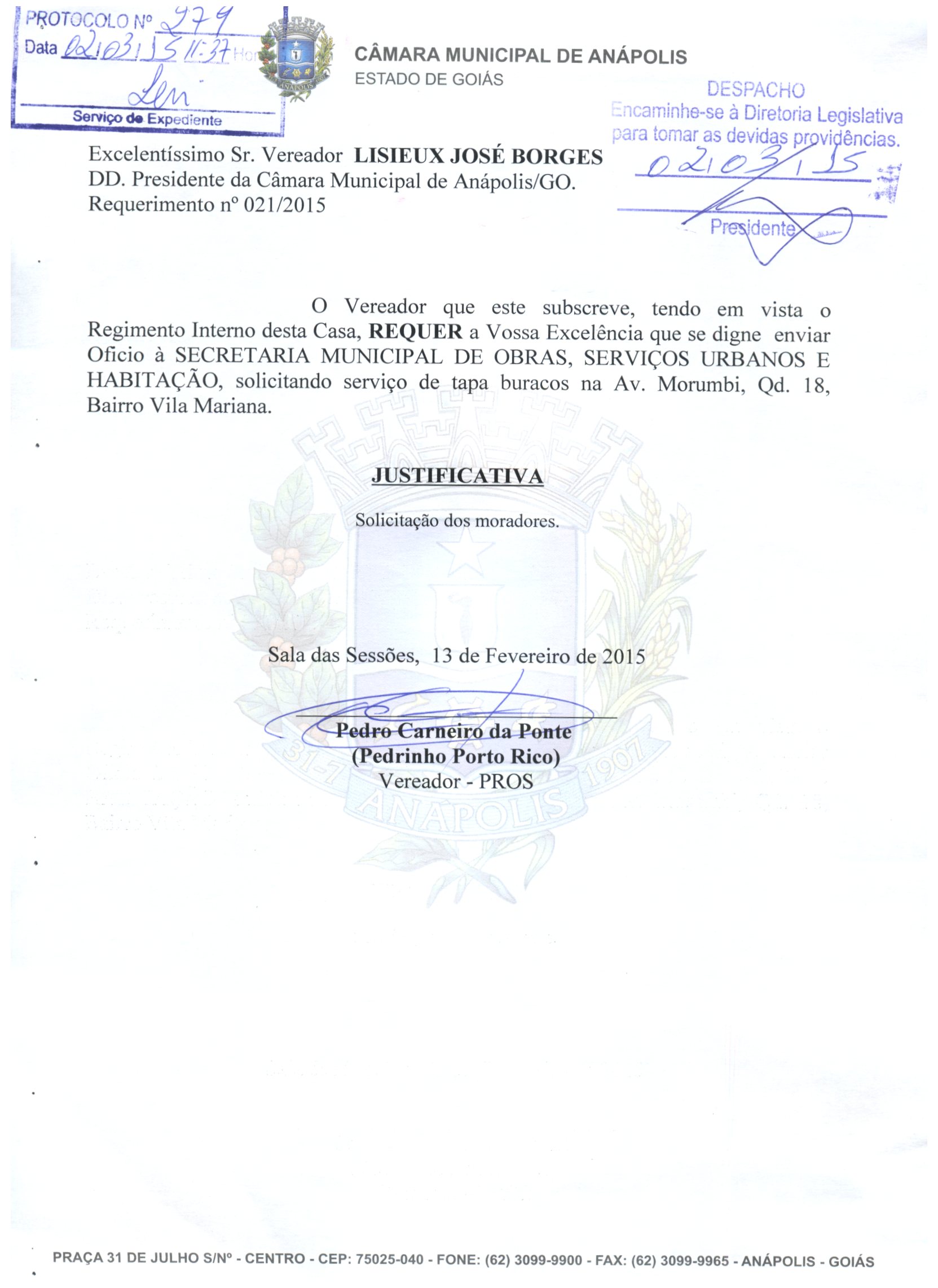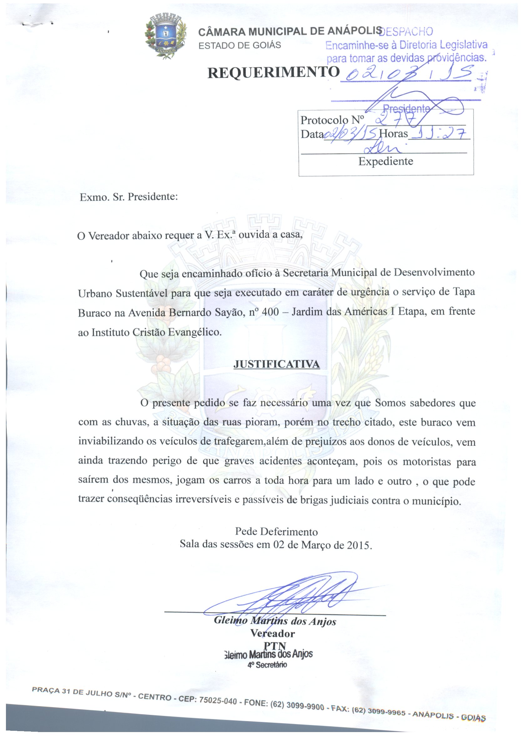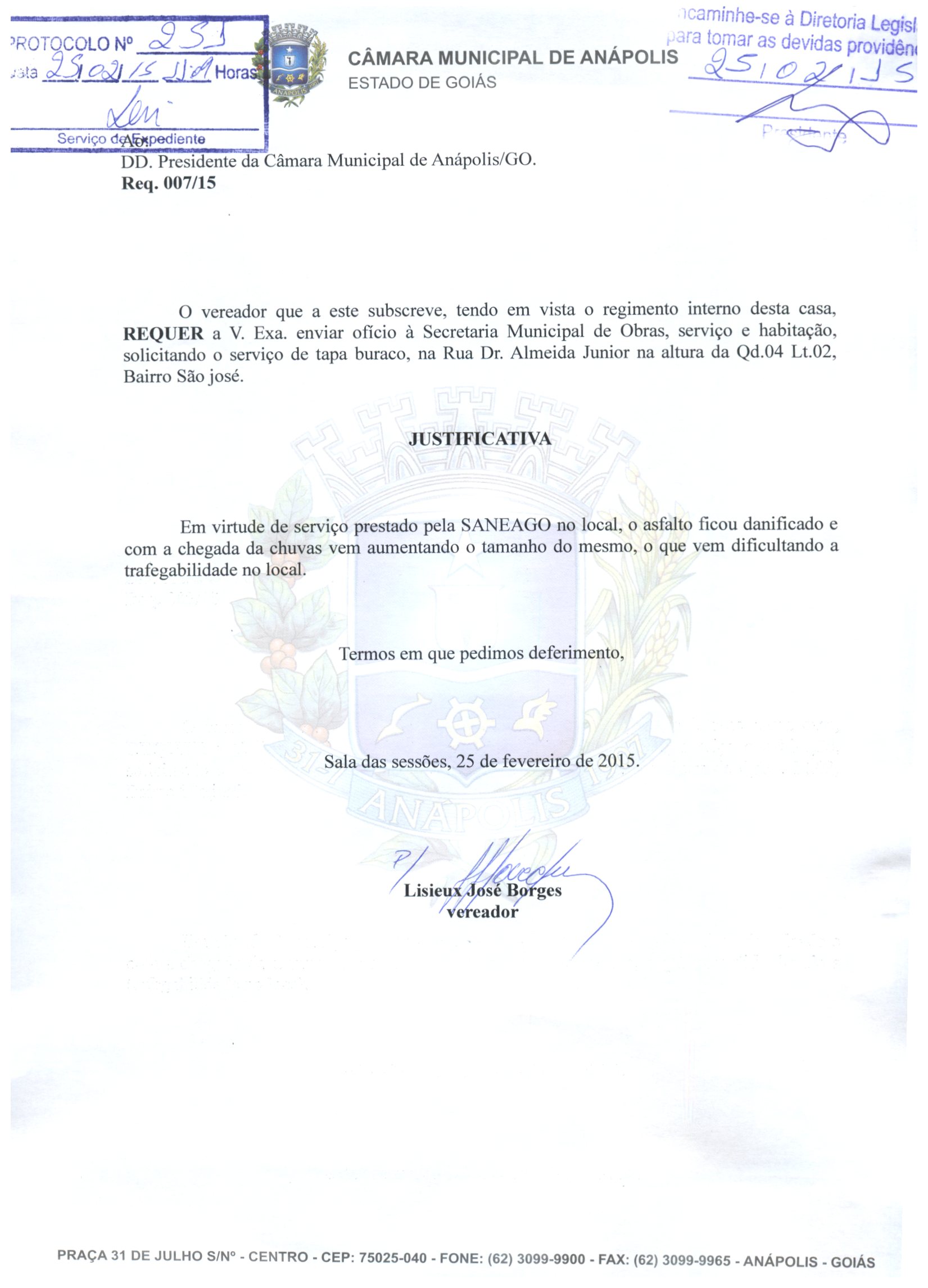 Ementa: O VEREADOR QUE A ESTE SUBSCREVE, TENDO EM VISTA O REGIMENTO INTERNO DESTA CASA, REQUER À V. EXA. ENVIAR OFÍCIO À SECRETARIA MUNICIPAL DE OBRAS, SERVIÇOS URBANOS E HABITAÇÃO, SOLICITANDO O SERVIÇO DE TAPA BURACO, NA RUA DR. ALMEIDA JUNIOR NA ALTURA DA QD.04 LT.02, BAIRRO SÃO JOSÉ.