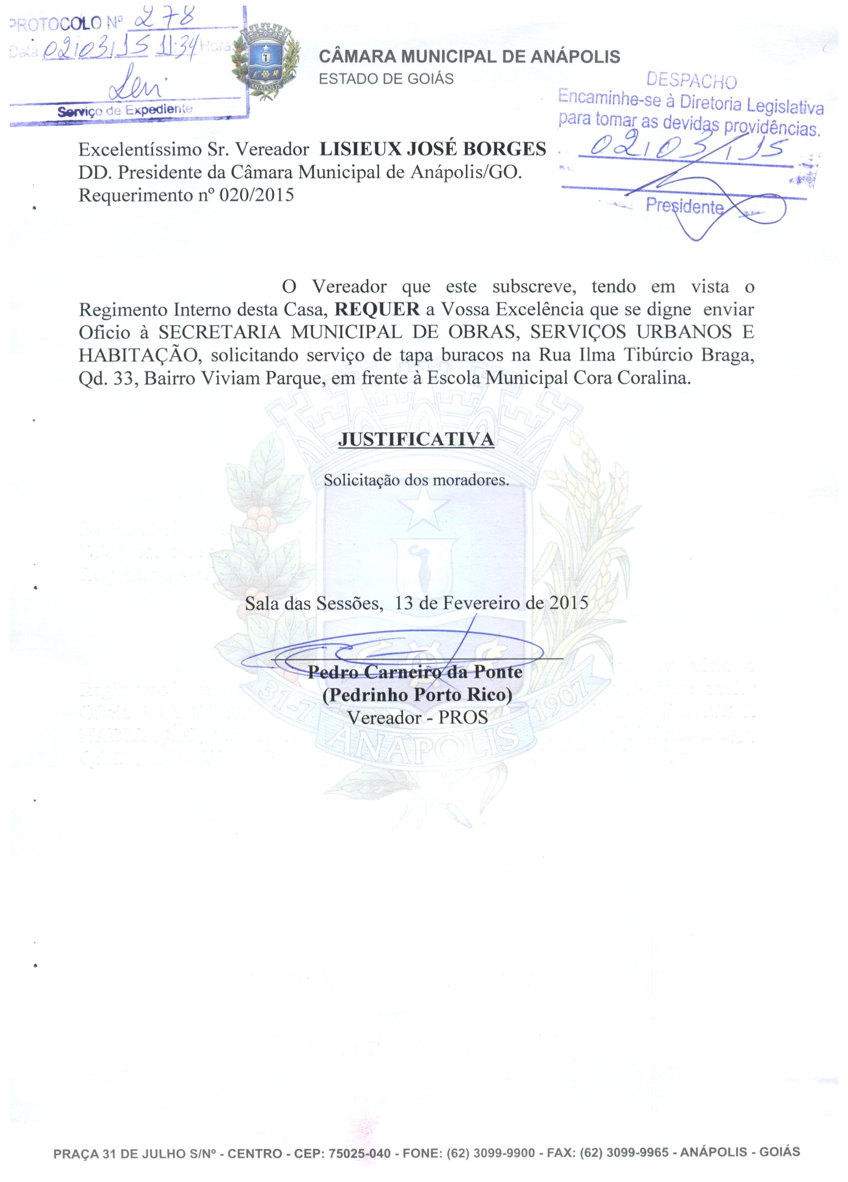 Ementa: O VEREADOR QUE ESTE SUBSCREVE, TENDO EM VISTA O REGIMENTO INTERNO DESTA CASA, REQUER À VOSSA EXCELÊNCIA QUE SE DIGNE ENVIAR OFÍCIO À SECRETARIA MUNICIPAL DE OBRAS, SERVIÇOS URBANOS E HABITAÇÃO, SOLICITANDO SERVIÇO DE TAPA BURACOS NA RUA ILMA TIBÚRCIO BRAGA, QD. 33, BAIRRO VIVIAN PARQUE, EM FRENTE A ESCOLA MUNICIPAL CORA CORALINA.