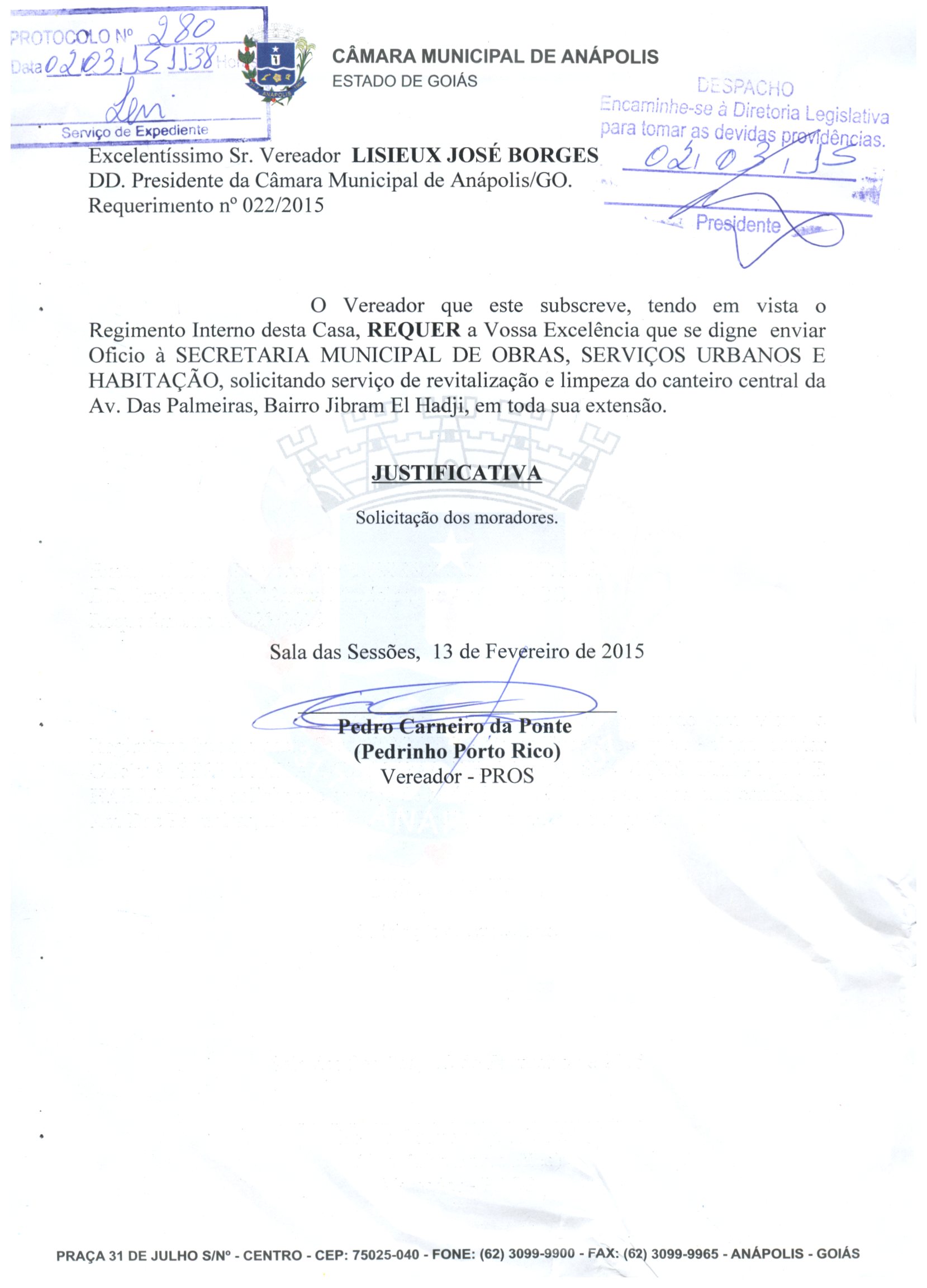 Ementa: O VEREADOR QUE ESTE SUBSCREVE, TENDO EM VISTA O REGIMENTO INTERNO DESTA CASA, REQUER À VOSSA EXCELÊNCIA QUE SE DIGNE ENVIAR OFÍCIO À SECRETARIA MUNICIPAL DE OBRAS, SERVIÇOS URBANOS E HABITAÇÃO, SOLICITANDO SERVIÇO DE REVITALIZAÇÃO E LIMPEZA DO CANTEIRO CENTRAL DA AV. DAS PALMEIRAS, BAIRRO JIBRAM EL HADJI, EM TODA SUA EXTENSÃO.