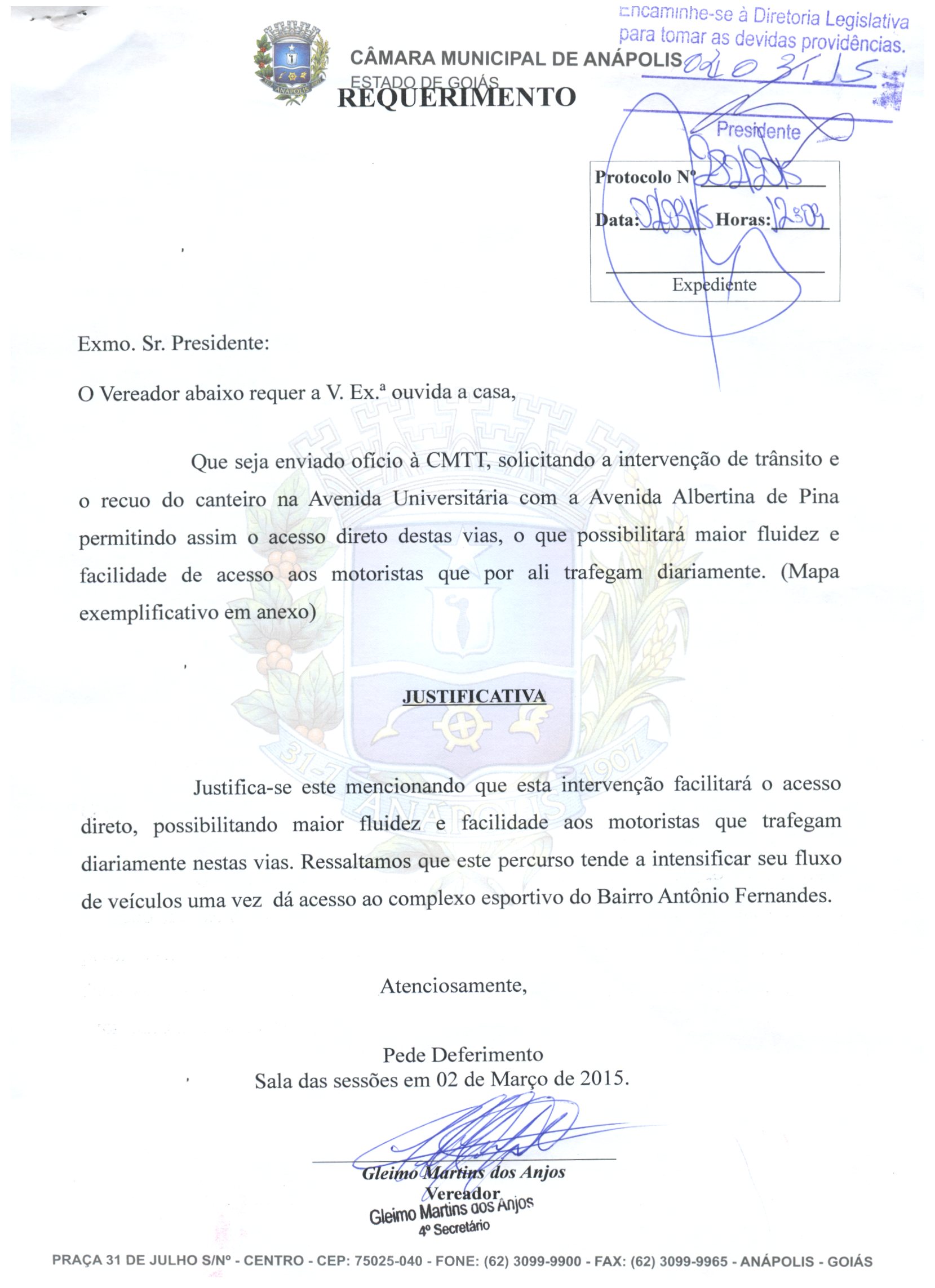 Ementa: REQUEIRO, NOS TERMOS DO ART 132, INCISO I, DO REGIMENTO INTERNO, QUE SEJA ENVIADO OFÍCIO À CMTT SOLICITANDO UM ESTUDO PARA AVALIAR A POSSIBILIDADE DE IMPLANTAÇÃO DE UM SEMÁFORO NA AVENIDA PEDRO LUDOVICO SAÍDA PARA NERÓPOLIS