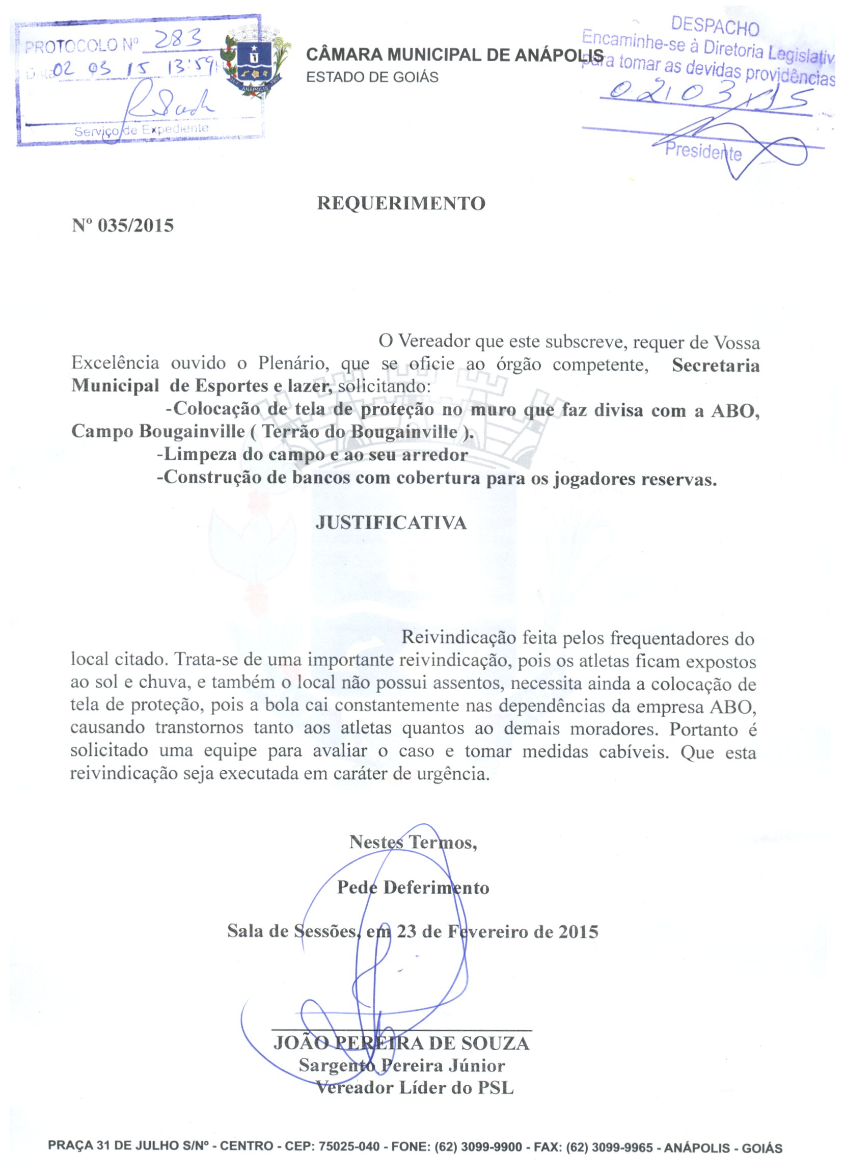 Ementa: O VEREADOR QUE ESTE SUBSCREVE, REQUER DE VOSSA EXCELÊNCIA OUVIDO O PLENÁRIO, QUE SE OFICIE AO ÓRGÃO COMPETENTE, SECRETARIA MUNICIPAL DE ESPORTES E LAZER, SOLICITANDO: -COLOCAÇÃO DE TELA DE PROTEÇÃO NO MURO QUE FAZ DIVISA COM A ABO, CAMPO BOUGAINVILLE ( TERRÃO DO BOUGAINVILLE ). -LIMPEZA DO CAMPO E AO SEU ARREDOR -CONSTRUÇÃO DE BANCOS COM COBERTURA PARA OS JOGADORES RESERVAS.
