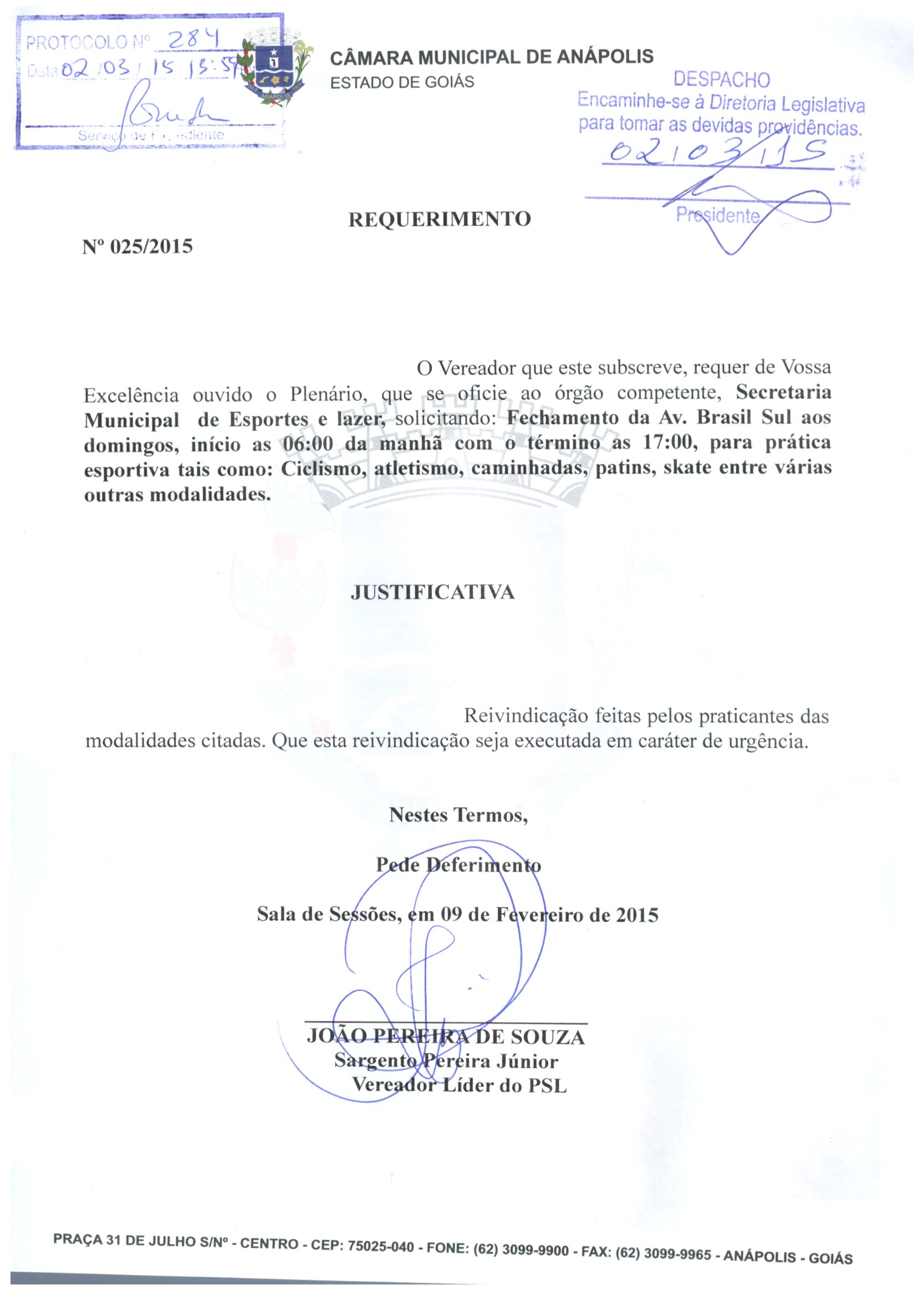 Ementa: O VEREADOR QUE ESTE SUBSCREVE, REQUER DE VOSSA EXCELÊNCIA OUVIDO O PLENÁRIO, QUE SE OFICIE AO ÓRGÃO COMPETENTE, SECRETARIA MUNICIPAL DE ESPORTES E LAZER, SOLICITANDO: FECHAMENTO DA AV. BRASIL SUL AOS DOMINGOS, INICIO AS 06:00 DA MANHÃ COM O TÉRMINO AS 17:00, PARA PRÁTICA ESPORTIVA TAIS COMO: CICLISMO, ATLETISMO, CAMINHADAS, PATINS, SKATE ENTRE VÁRIAS OUTRAS MODALIDADES.