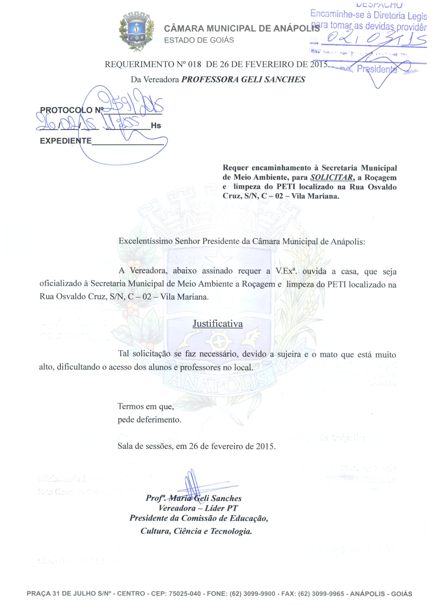 Ementa: A VEREADORA, ABAIXO ASSINADO REQUER À V.EXA. OUVIDA A CASA, QUE SEJA OFICIALIZADO À SECRETARIA MUNICIPAL DE MEIO AMBIENTE A ROÇAGEM E LIMPEZA DO PETI LOCALIZADO NA RUA OSVALDO CRUZ, S/N, C — 02 — VILA MARIANA.