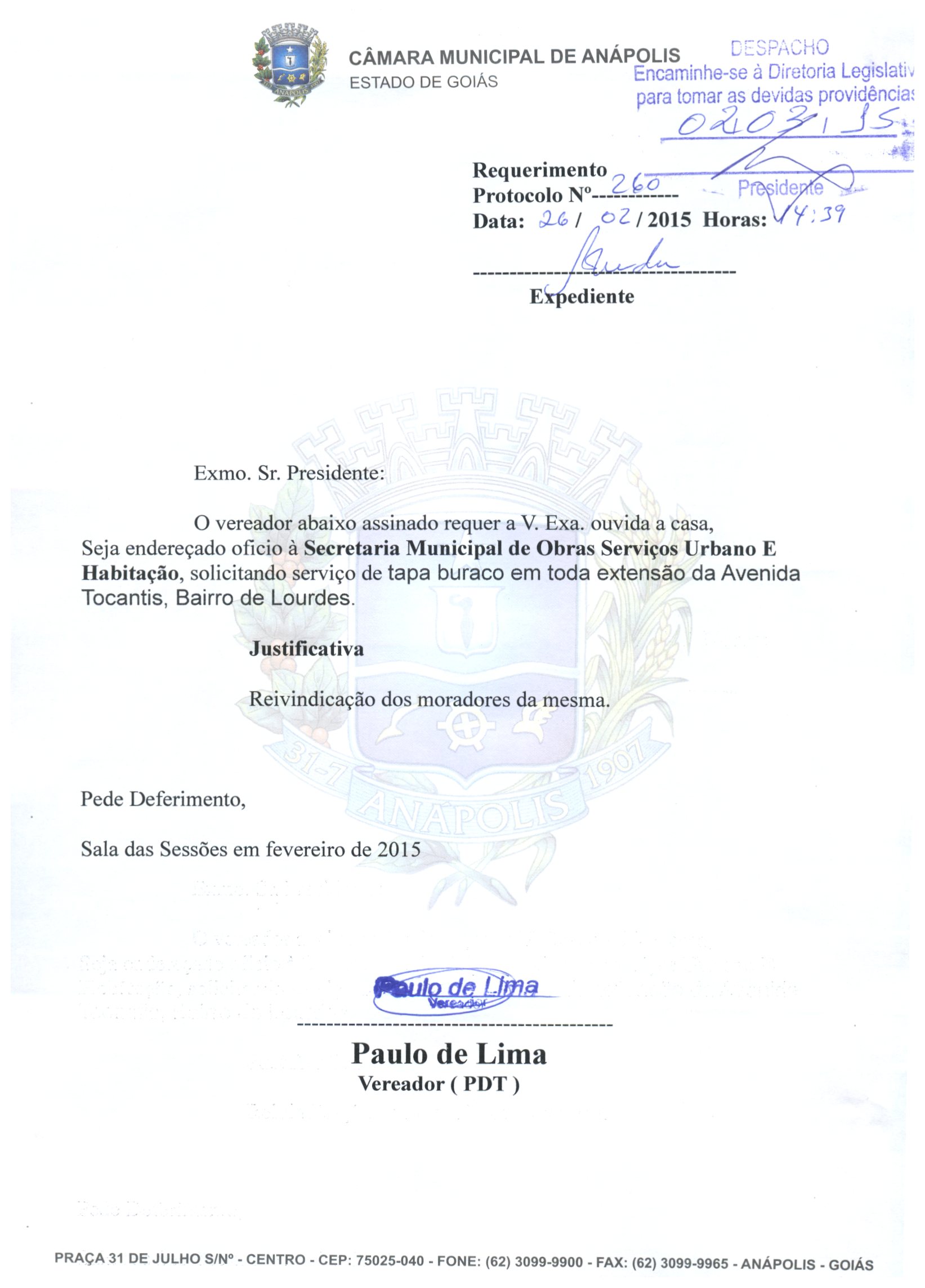 Ementa: O VEREADOR ABAIXO ASSINADO REQUER À V. EXA. OUVIDA A CASA, SEJA ENDEREÇADO OFÍCIO À SECRETARIA MUNICIPAL DE OBRAS SERVIÇOS URBANO E HABITAÇÃO, SOLICITANDO SERVIÇO DE TAPA BURACO EM TODA EXTENSÃO DA AVENIDA TOCANTINS, BAIRRO DE LOURDES.
