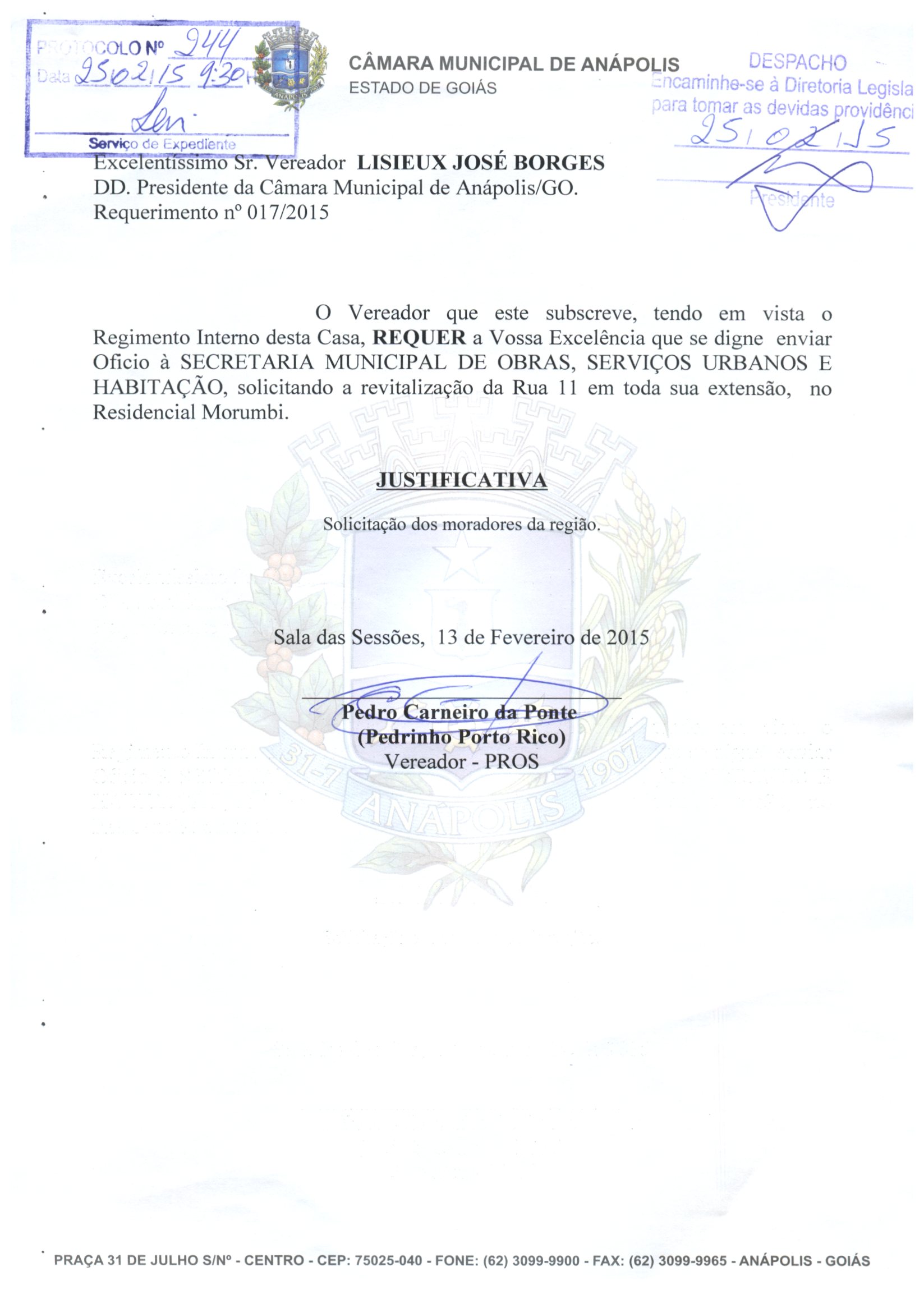 Ementa: O VEREADOR QUE ESTE SUBSCREVE, TENDO EM VISTA O REGIMENTO INTERNO DESTA CASA, REQUER À VOSSA EXCELÊNCIA QUE SE DIGNE ENVIAR OFÍCIO À SECRETARIA MUNICIPAL DE OBRAS, SERVIÇOS URBANOS E HABITAÇÃO, SOLICITANDO A REVITALIZAÇÃO DA RUA 11 EM TODA SUA EXTENSÃO, NO RESIDENCIAL MORUMBI.