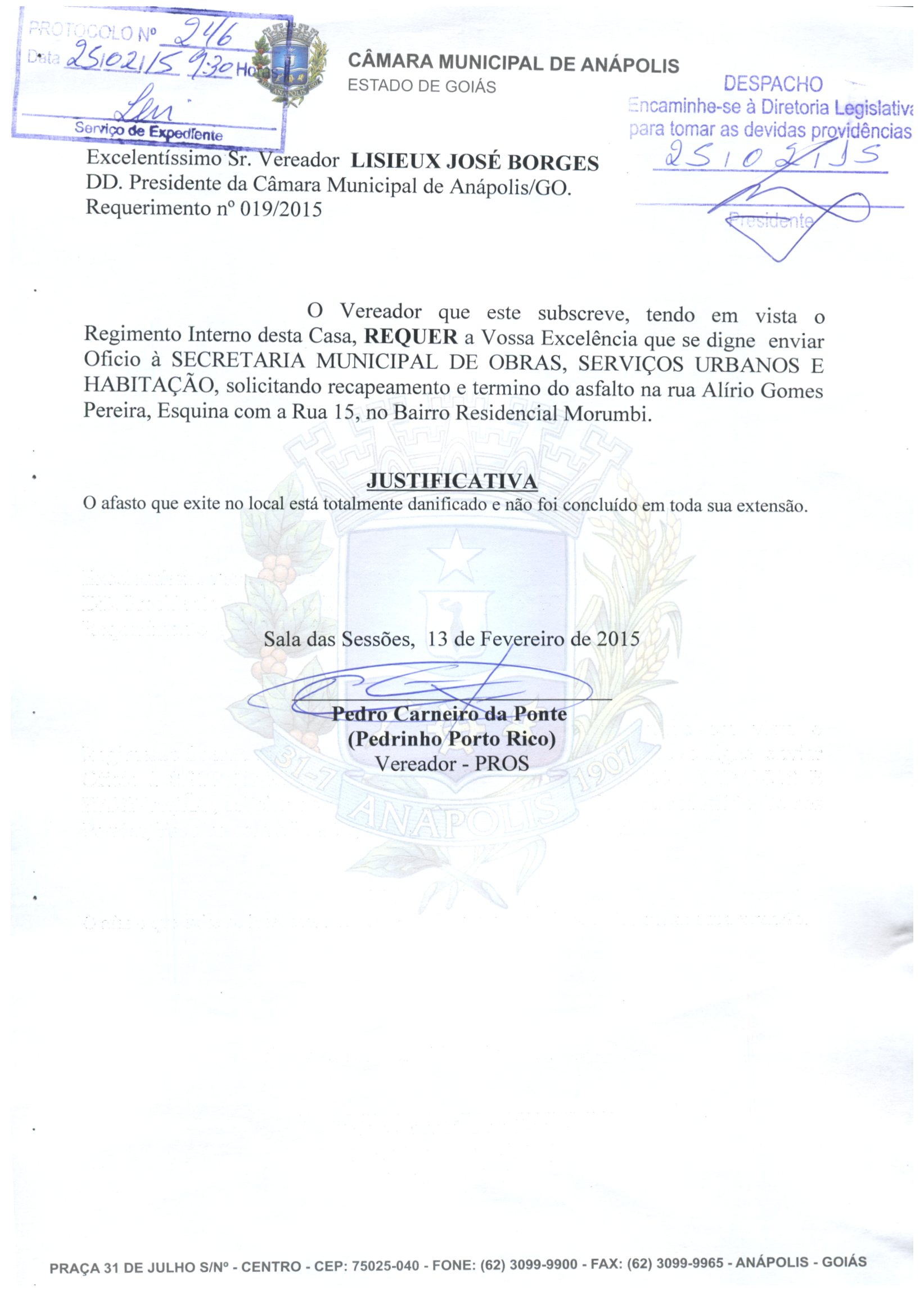 Ementa: O VEREADOR QUE ESTE SUBSCREVE, TENDO EM VISTA O REGIMENTO INTERNO DESTA CASA, REQUER À VOSSA EXCELÊNCIA QUE SE DIGNE ENVIAR OFÍCIO À SECRETARIA MUNICIPAL DE OBRAS, SERVIÇOS URBANOS E HABITAÇÃO, SOLICITANDO RECAPEAMENTO E TÉRMINO DO ASFALTO NA RUA ALÍRIO GOMES PEREIRA, ESQUINA COM A RUA 15, NO BAIRRO RESIDENCIAL MORUMBI.