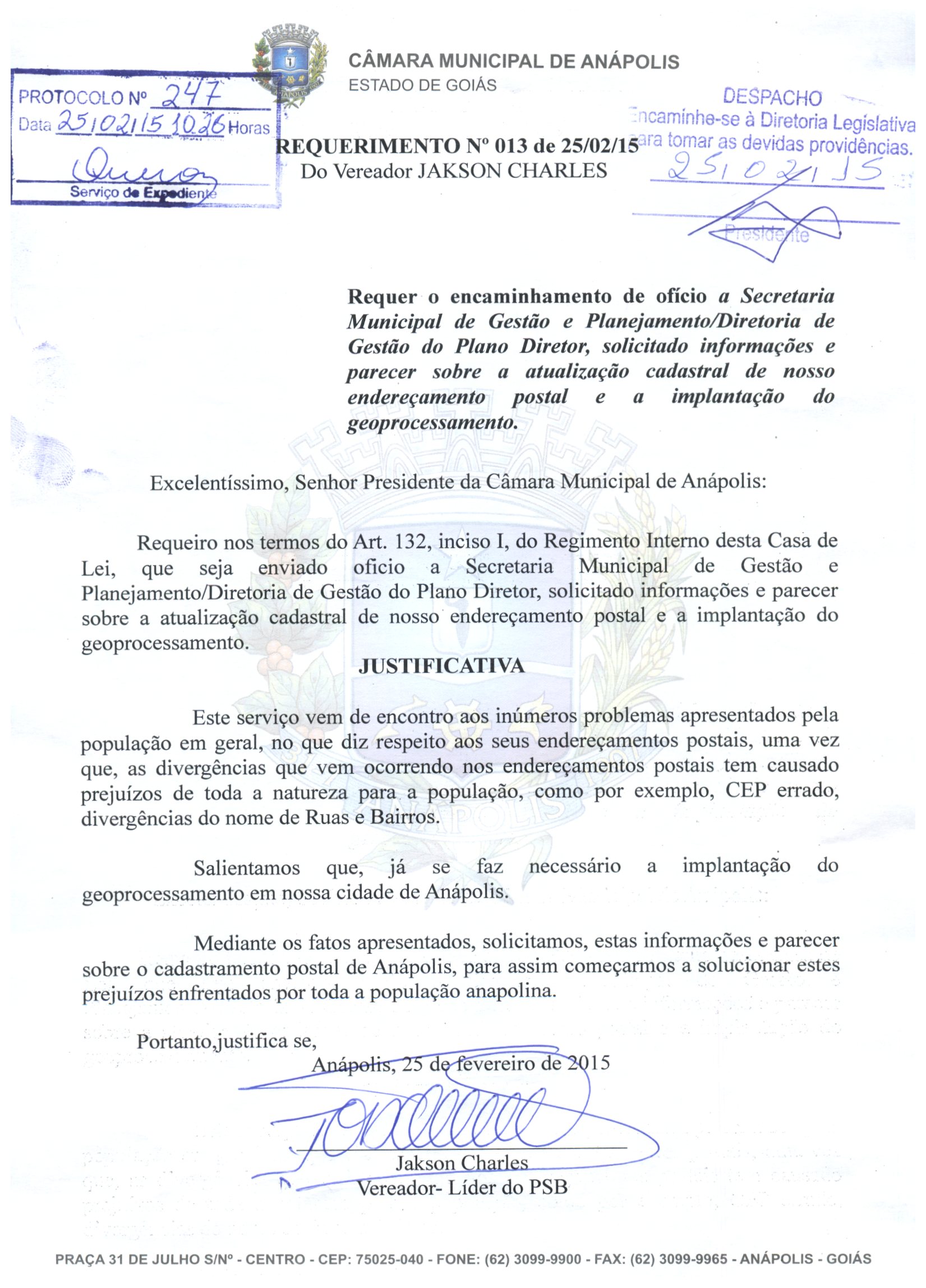 Ementa: REQUEIRO NOS TERMOS DO ART. 132, INCISO I, DO REGIMENTO INTERNO DESTA CASA DE LEI, QUE SEJA ENVIADO OFÍCIO À SECRETARIA MUNICIPAL DE GESTÃO E PLANEJAMENTO/DIRETORIA DE GESTÃO DO PLANO DIRETOR, SOLICITANDO INFORMAÇÕES E PARECER SOBRE A ATUALIZAÇÃO CADASTRAL DE NOSSO ENDEREÇAMENTO POSTAL E A IMPLANTAÇÃO DO GEOPROCESSAMENTO.