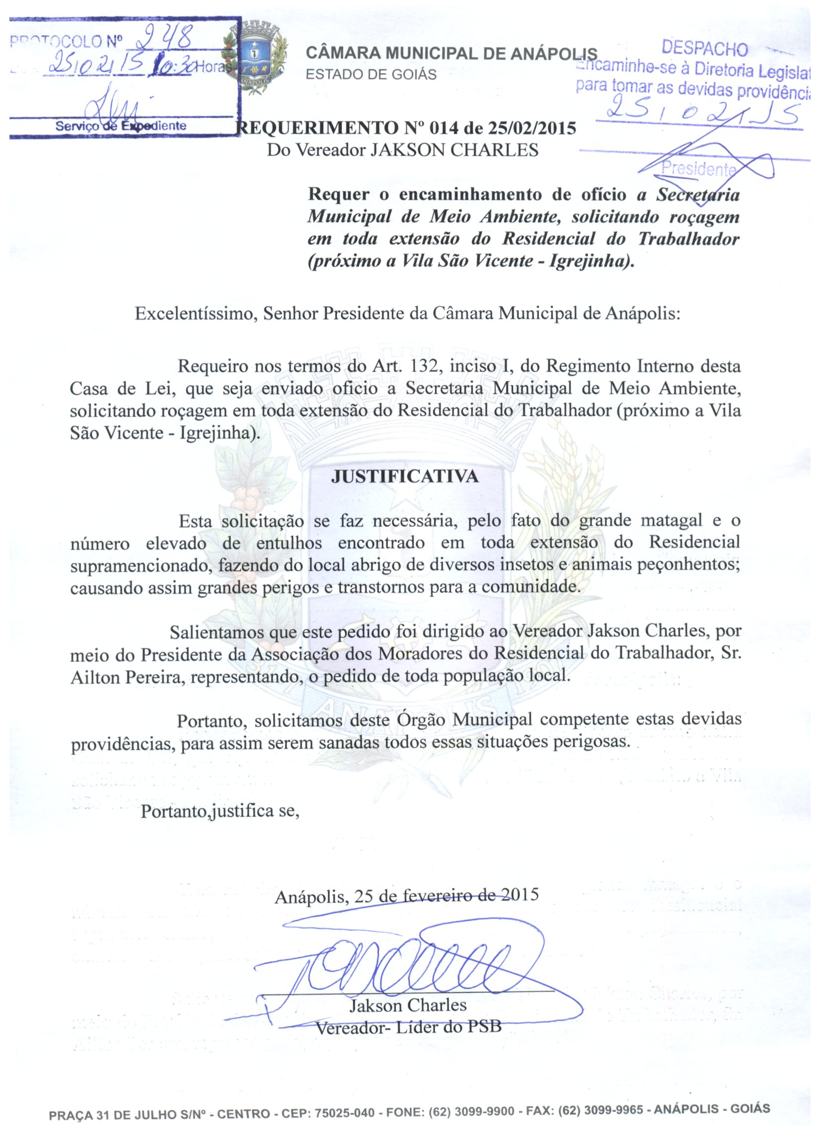 Ementa: REQUEIRO NOS TERMOS DO ART. 132, INCISO I, DO REGIMENTO INTERNO DESTA CASA DE LEI, QUE SEJA ENVIADO OFÍCIO À SECRETARIA MUNICIPAL DE MEIO AMBIENTE, SOLICITANDO ROÇAGEM EM TODA EXTENSÃO DO RESIDENCIAL DO TRABALHADOR (PRÓXIMO A VILA SÃO VICENTE - IGREJINHA).