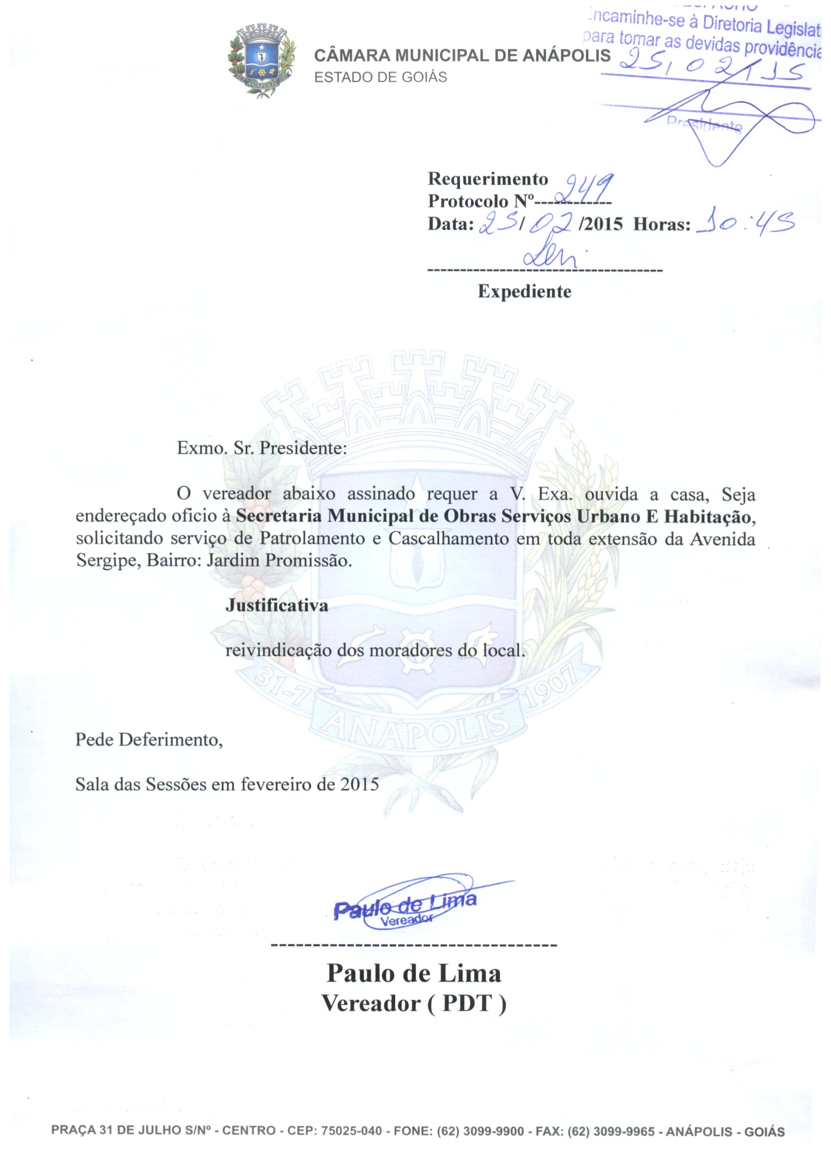 Ementa: O VEREADOR ABAIXO ASSINADO REQUER À V. EXA. OUVIDA A CASA, SEJA ENDEREÇADO OFÍCIO À SECRETARIA MUNICIPAL DE OBRAS SERVIÇOS URBANOS E HABITAÇÃO, SOLICITANDO SERVIÇO DE PATROLAMENTO E CASCALHAMENTO EM TODA EXTENSÃO DA AVENIDA SERGIPE, BAIRRO: JARDIM PROMISSÃO.