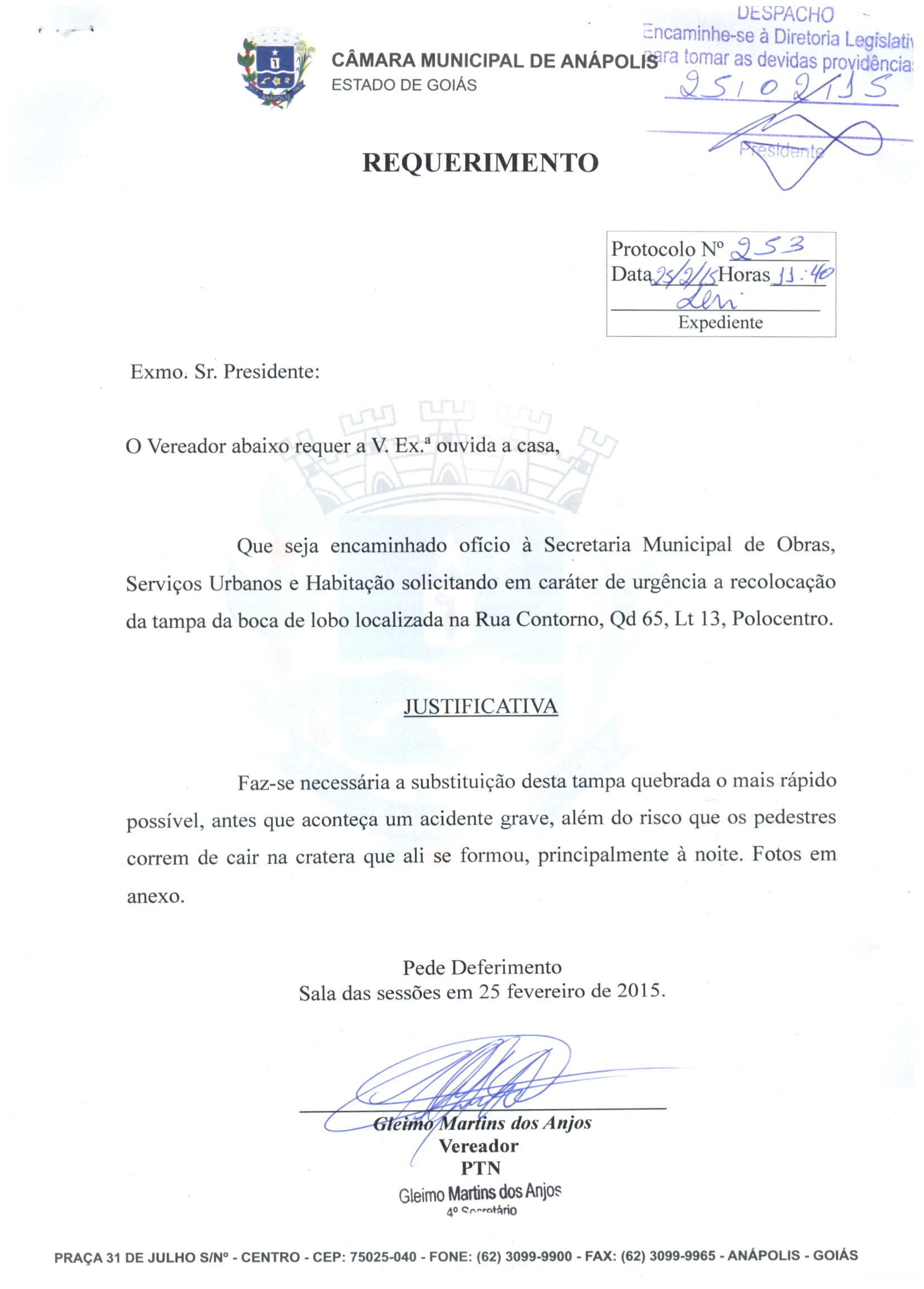 Ementa: QUE SEJA ENCAMINHADO OFÍCIO À SECRETARIA MUNICIPAL DE OBRAS, SERVIÇOS URBANOS E HABITAÇÃO SOLICITANDO EM CARÁTER DE URGÊNCIA A RECOLOCAÇÃO DA TAMPA DA BOCA DE LOBO LOCALIZADA NA RUA CONTORNO, QD 65, LT 13, POLOCENTRO.