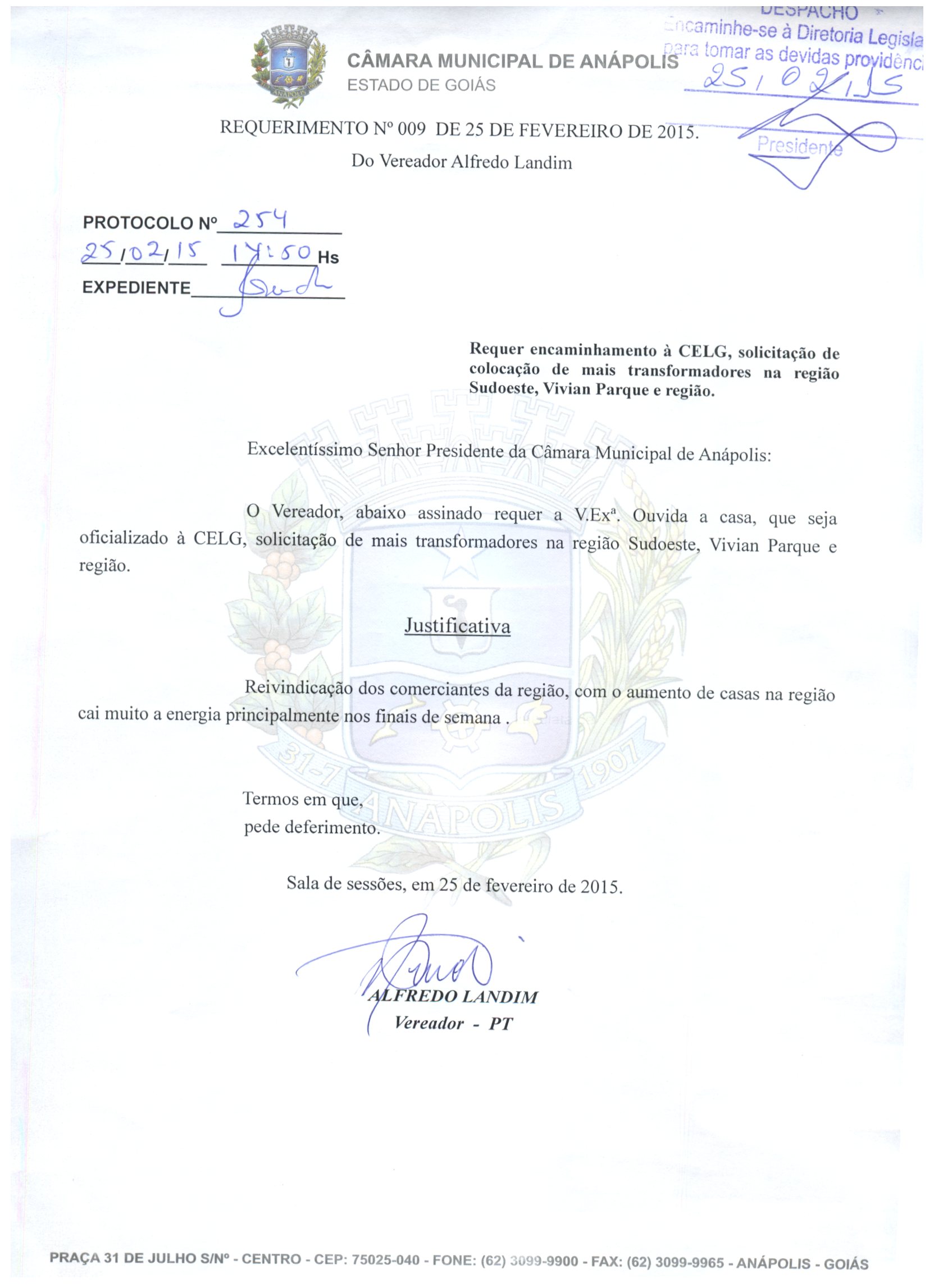 Ementa: O VEREADOR, ABAIXO ASSINADO REQUER À V.EXª. OUVIDA A CASA, QUE SEJA OFICIALIZADO À CELG, SOLICITAÇÃO DE MAIS TRANSFORMADORES NA REGIÃO SUDOESTE, VIVIAN PARQUE E REGIÃO.