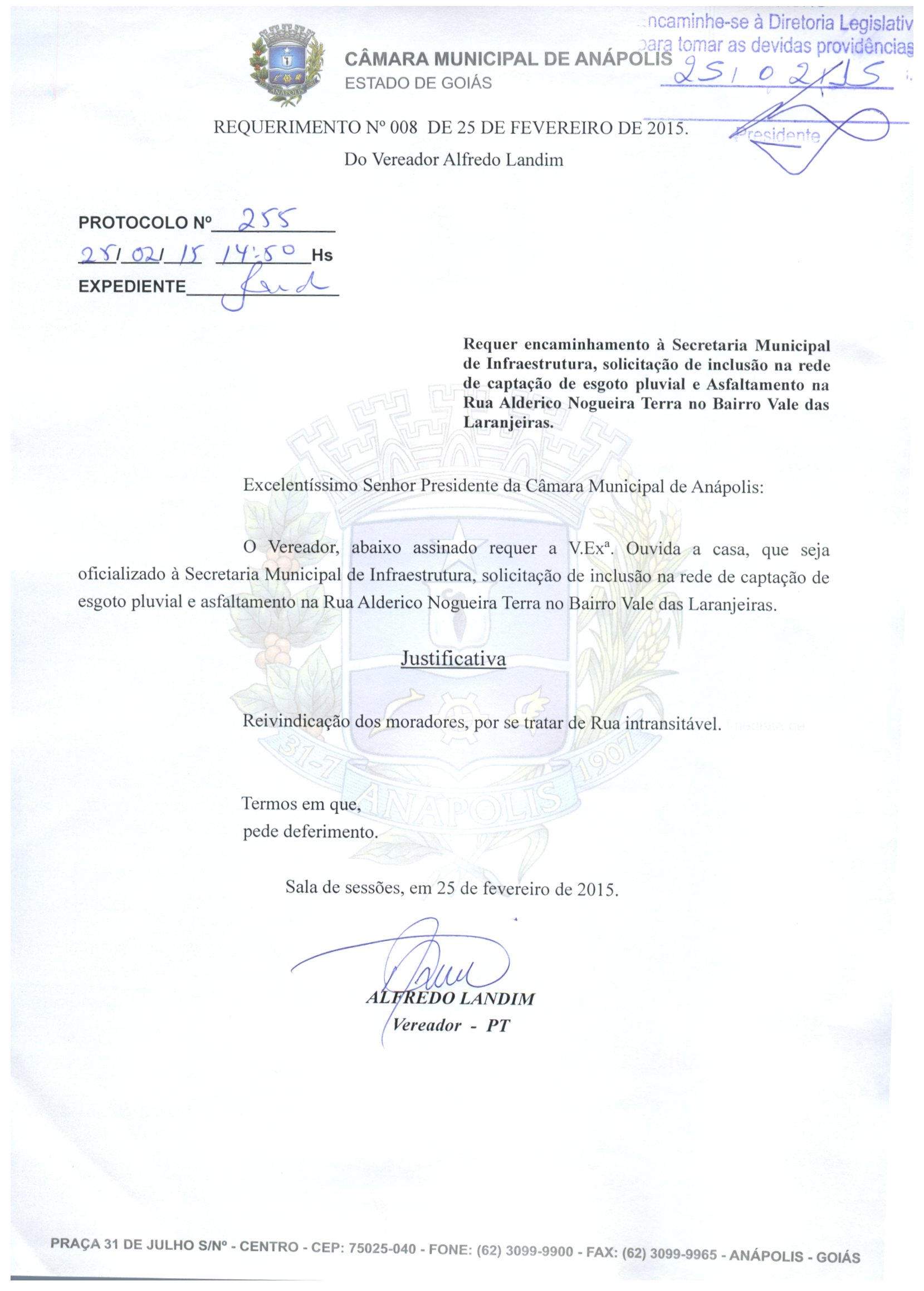 Ementa: O VEREADOR, ABAIXO ASSINADO REQUER À V.EXA. OUVIDA A CASA, QUE SEJA OFICIALIZADO À SECRETARIA MUNICIPAL DE INFRAESTRUTURA, SOLICITAÇÃO DE INCLUSÃO NA REDE DE CAPTAÇÃO DE ESGOTO PLUVIAL E ASFALTAMENTO NA RUA ALDERICO NOGUEIRA TERRA NO BAIRRO VALE DAS LARANJEIRAS.