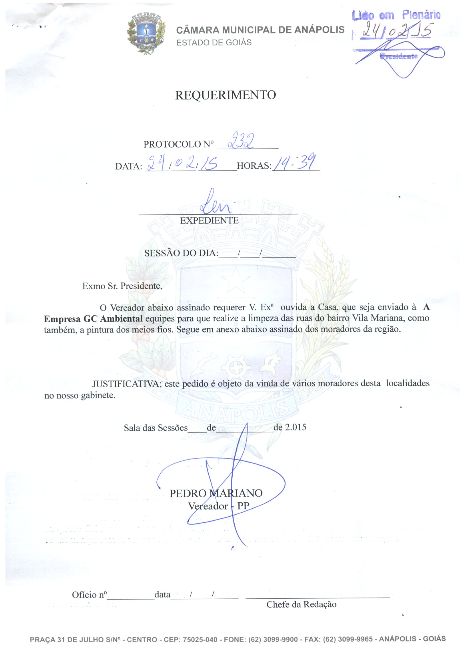 Ementa: O VEREADOR ABAIXO ASSINADO REQUER À V. EXA OUVIDA A CASA, QUE SEJA ENVIADO À A EMPRESA GC AMBIENTAL EQUIPES PARA QUE REALIZE A LIMPEZA DAS RUAS DO BAIRRO VILA MARIANA, COMO TAMBÉM, A PINTURA DOS MEIOS FIOS.