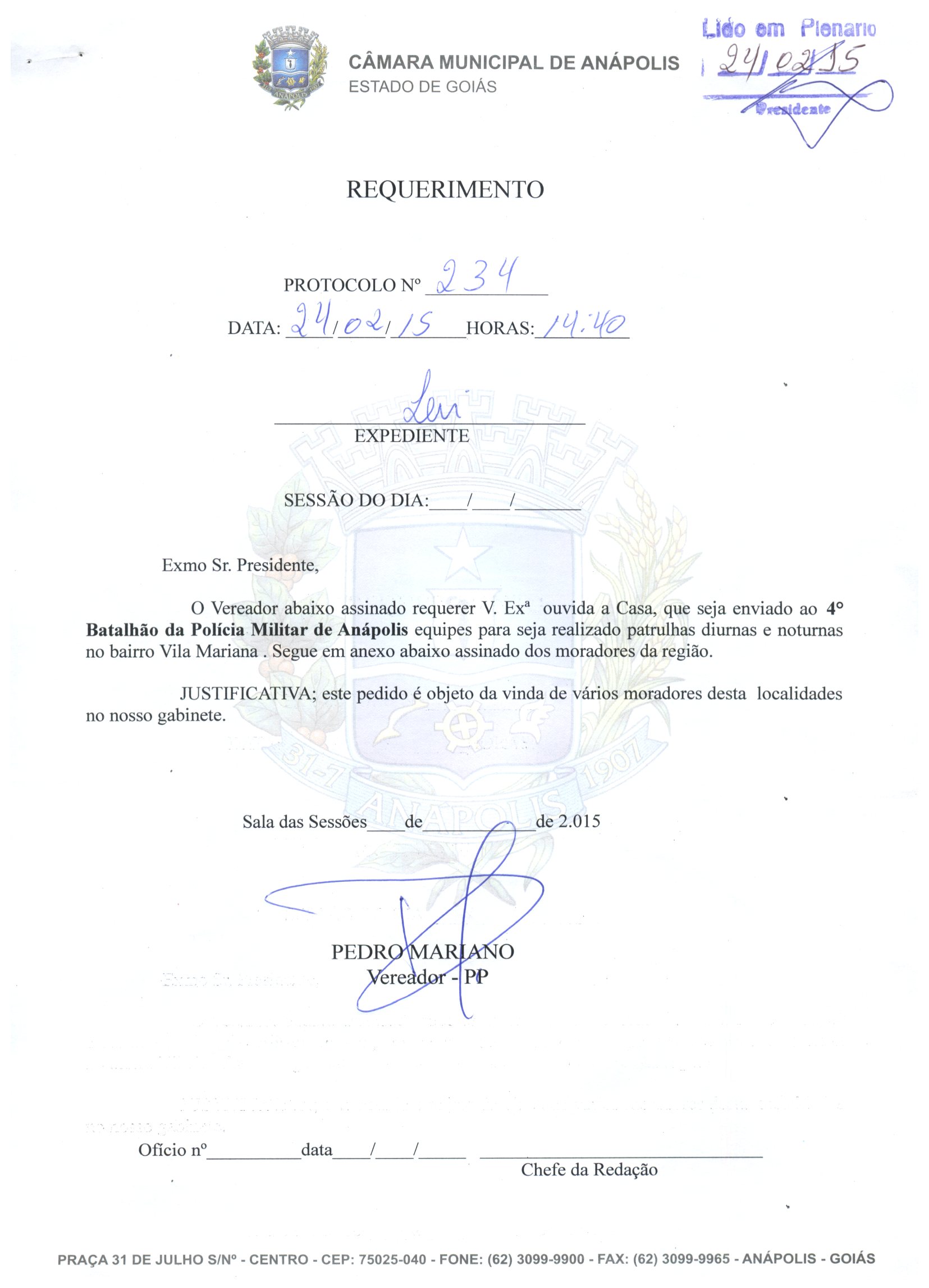 Ementa: O VEREADOR ABAIXO ASSINADO REQUER À V. EXA OUVIDA A CASA, QUE SEJA ENVIADO OFÍCIO AO 4° BATALHÃO DA POLÍCIA MILITAR DE ANÁPOLIS SOLICITANDO EQUIPES PARA SEJA REALIZADO PATRULHAS DIURNAS E NOTURNAS NO BAIRRO VILA MARIANA.